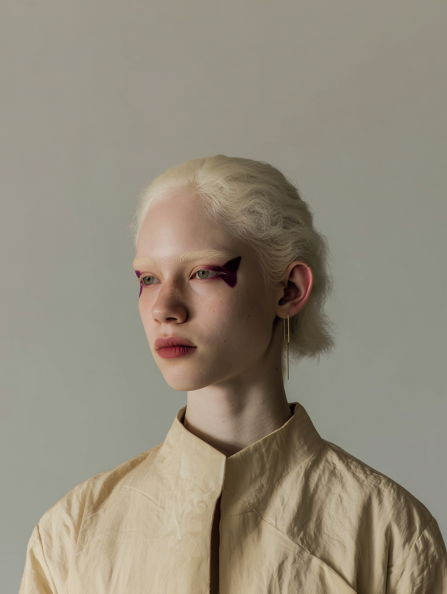 Striking portrait of a person with platinum blonde hair, bold purple eye makeup, and a beige high-collar shirt against a neutral background.