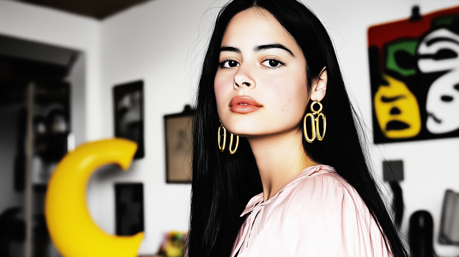 Stylish woman with long black hair, gold earrings, and a pink blouse in an artistic indoor setting with modern decor and bold colors.