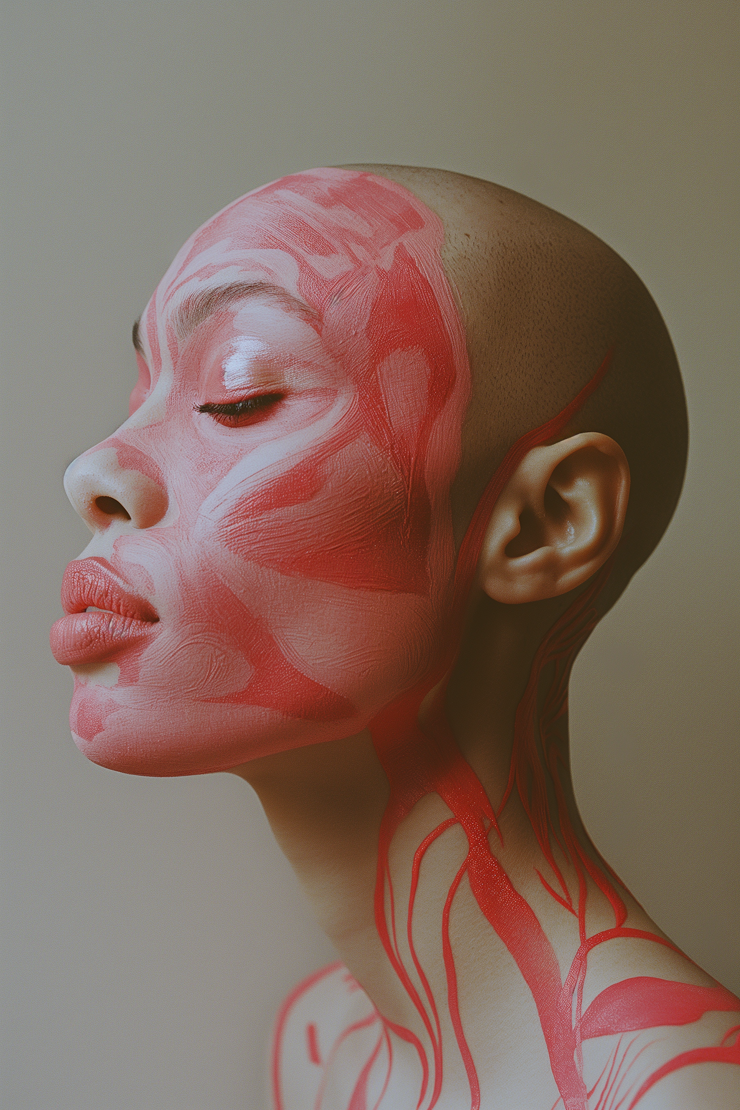 Bald individual with red paint patterns on face and neck, eyes closed, serene expression, light brown skin, neutral background.