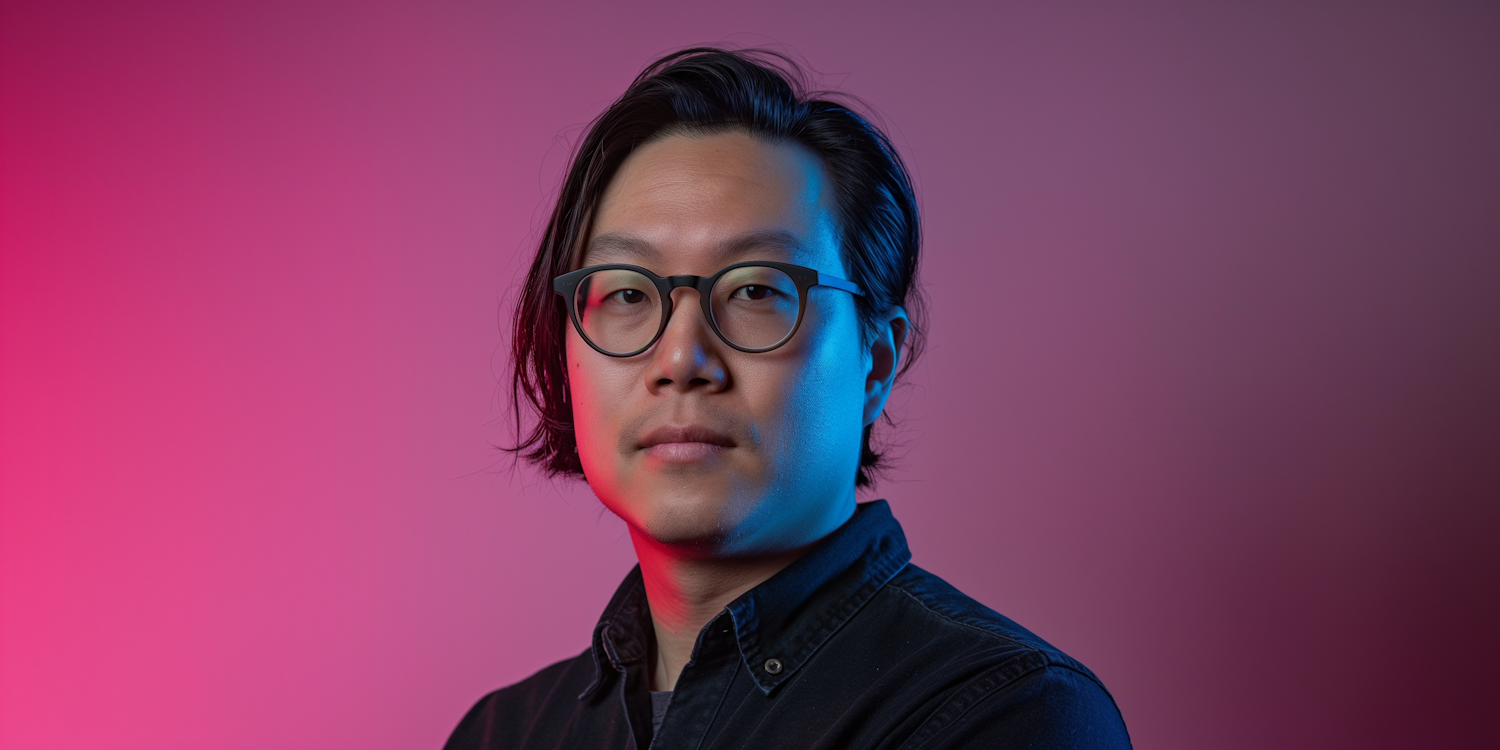 Portrait of an Asian man with glasses, artistic pink and blue lighting, and a gradient background for a modern, vibrant look.