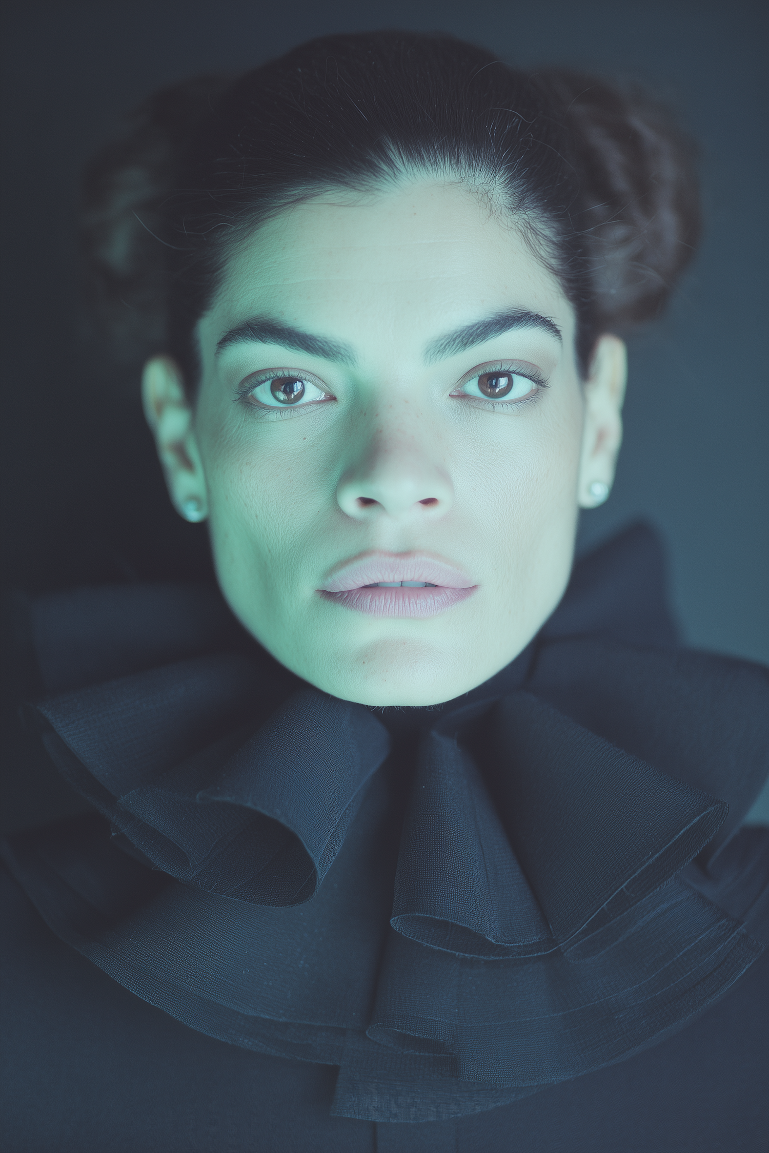 Artistic portrait of a person with a dramatic black ruffled collar and greenish lighting, creating a surreal and striking visual effect.