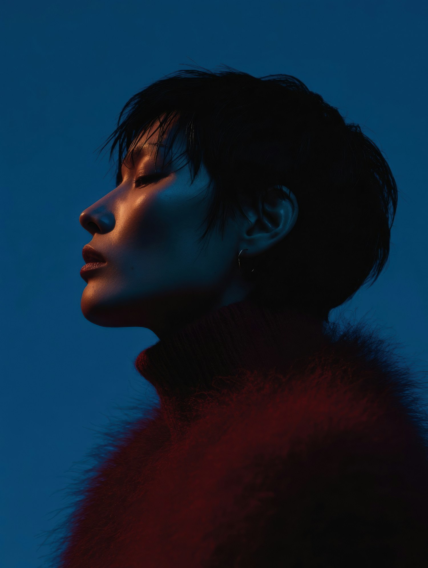 Artistic profile portrait of a person in dramatic lighting, wearing a red textured sweater against a blue background.