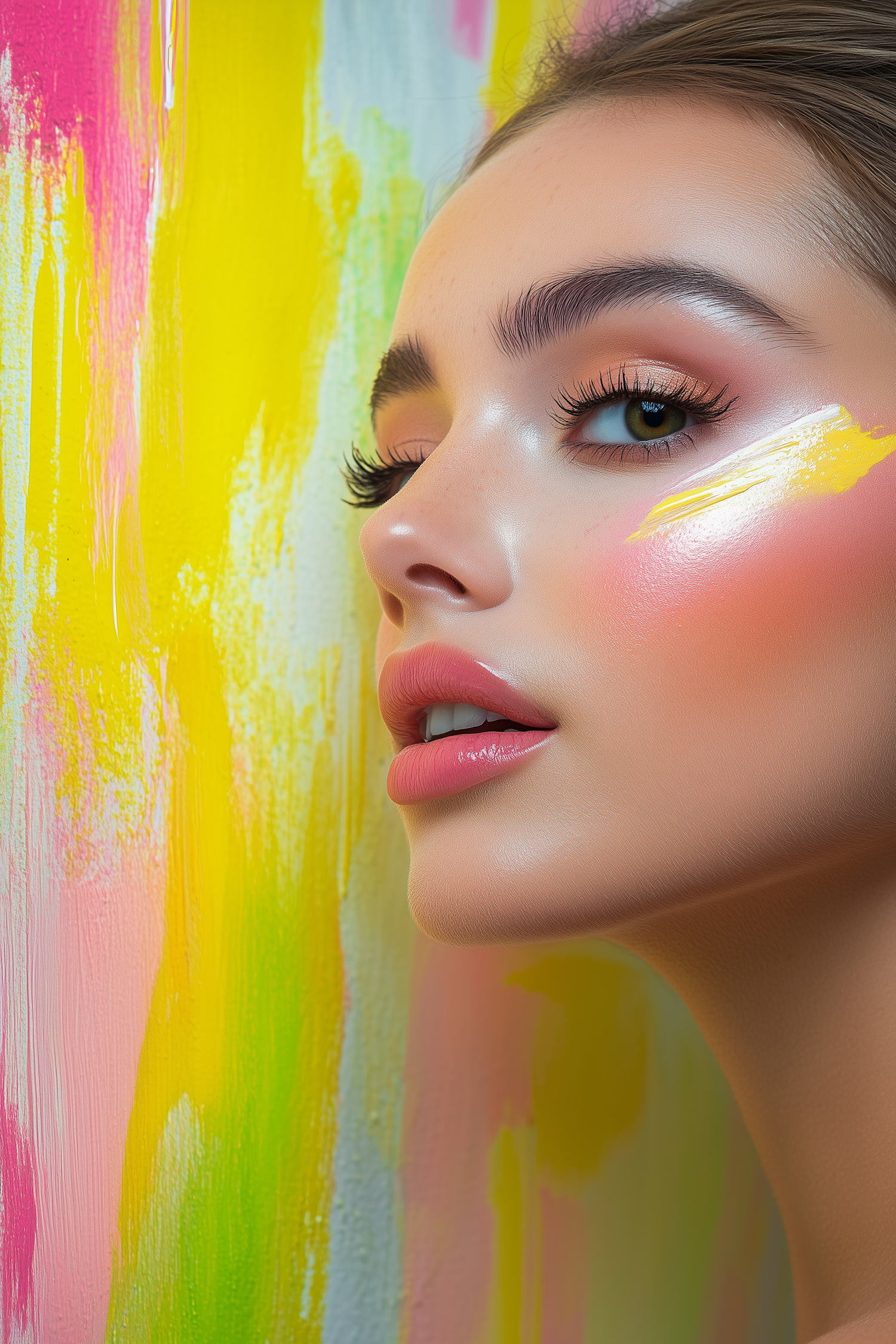 Close-up of a woman with artistic makeup and a colorful abstract background, featuring a bold yellow paint streak on her cheek.
