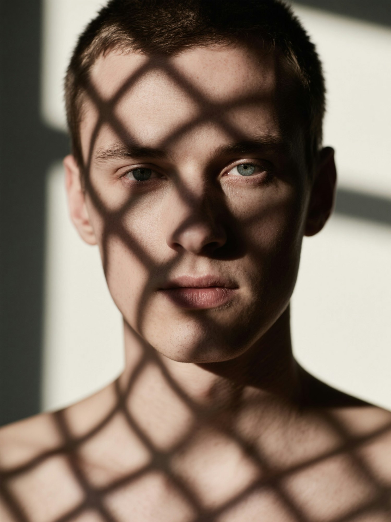 Close-up of a young man with grid-patterned shadows on his face, creating a striking interplay of light and shadow.