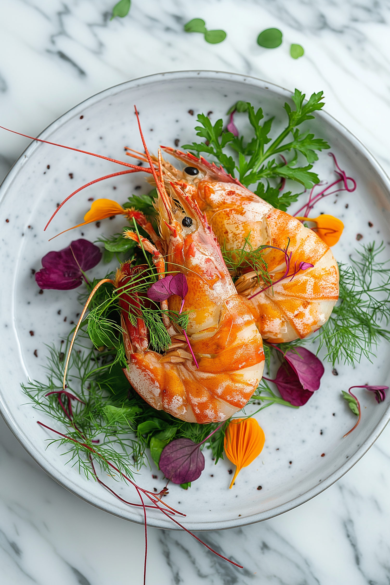 Elegant dish of vibrant orange prawns garnished with fresh herbs and edible flowers on a white plate, perfect for gourmet dining.