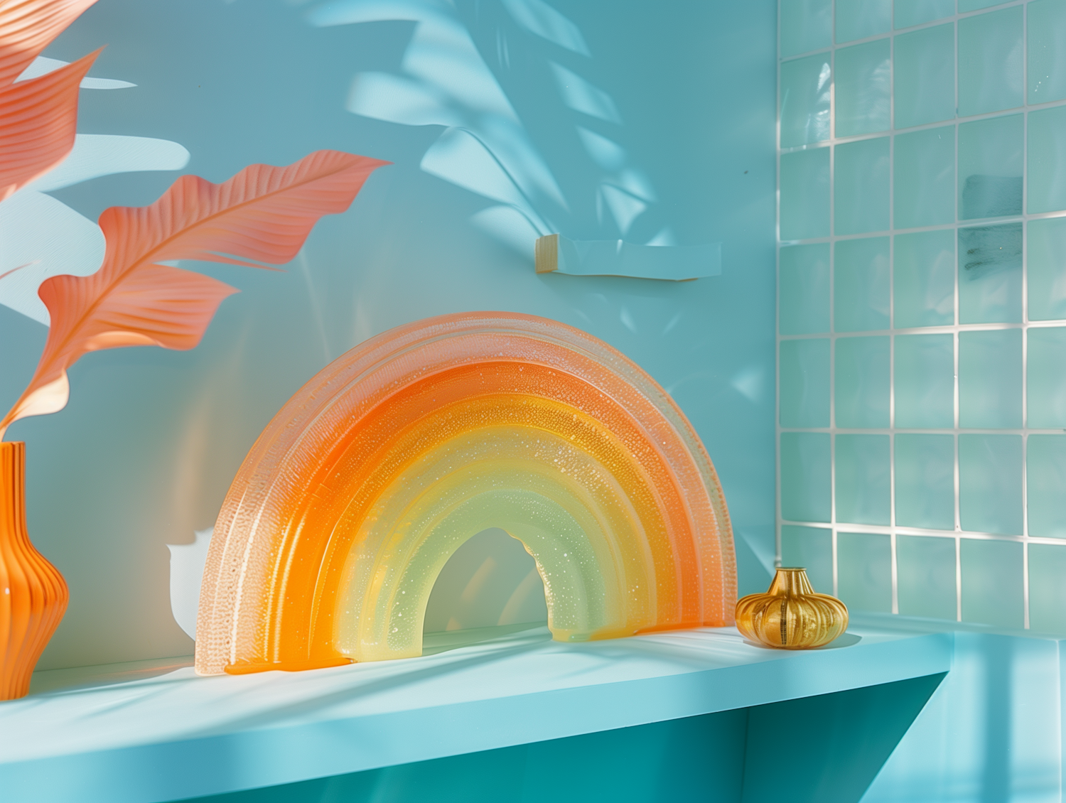 Colorful rainbow sculpture on a teal shelf with orange vase and golden decor, set against a tiled wall with leaf shadows.