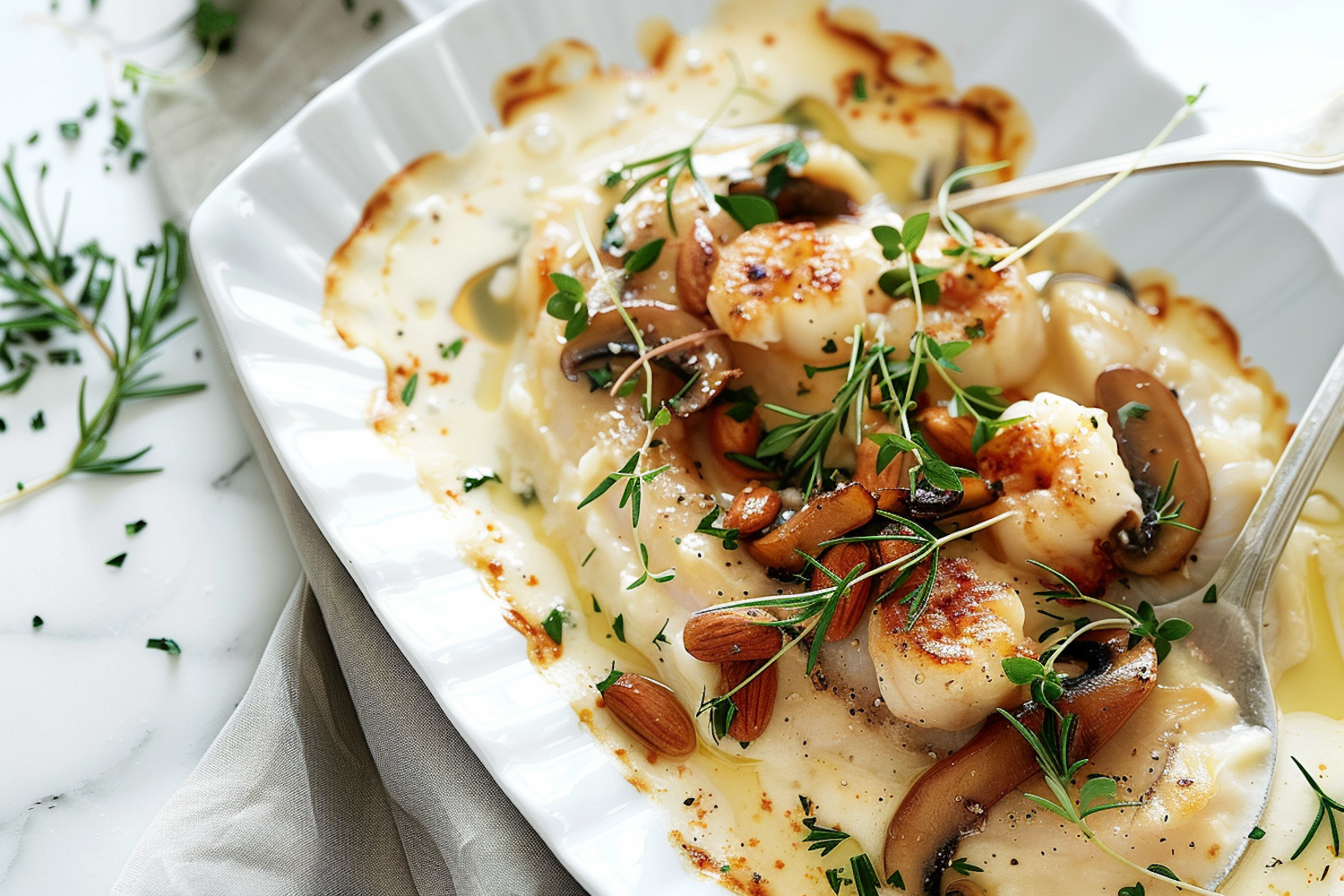 Seared scallops with mushrooms and almonds on a creamy sauce, garnished with fresh herbs on a white plate.