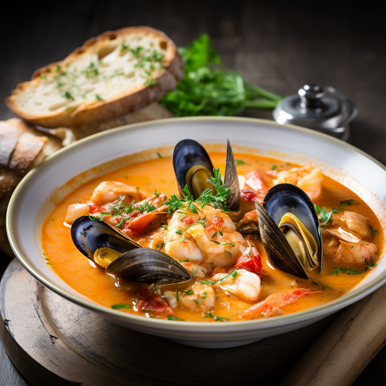 Delicious seafood stew with shrimp, mussels, and fish in a rich broth, garnished with herbs and served with crusty bread.