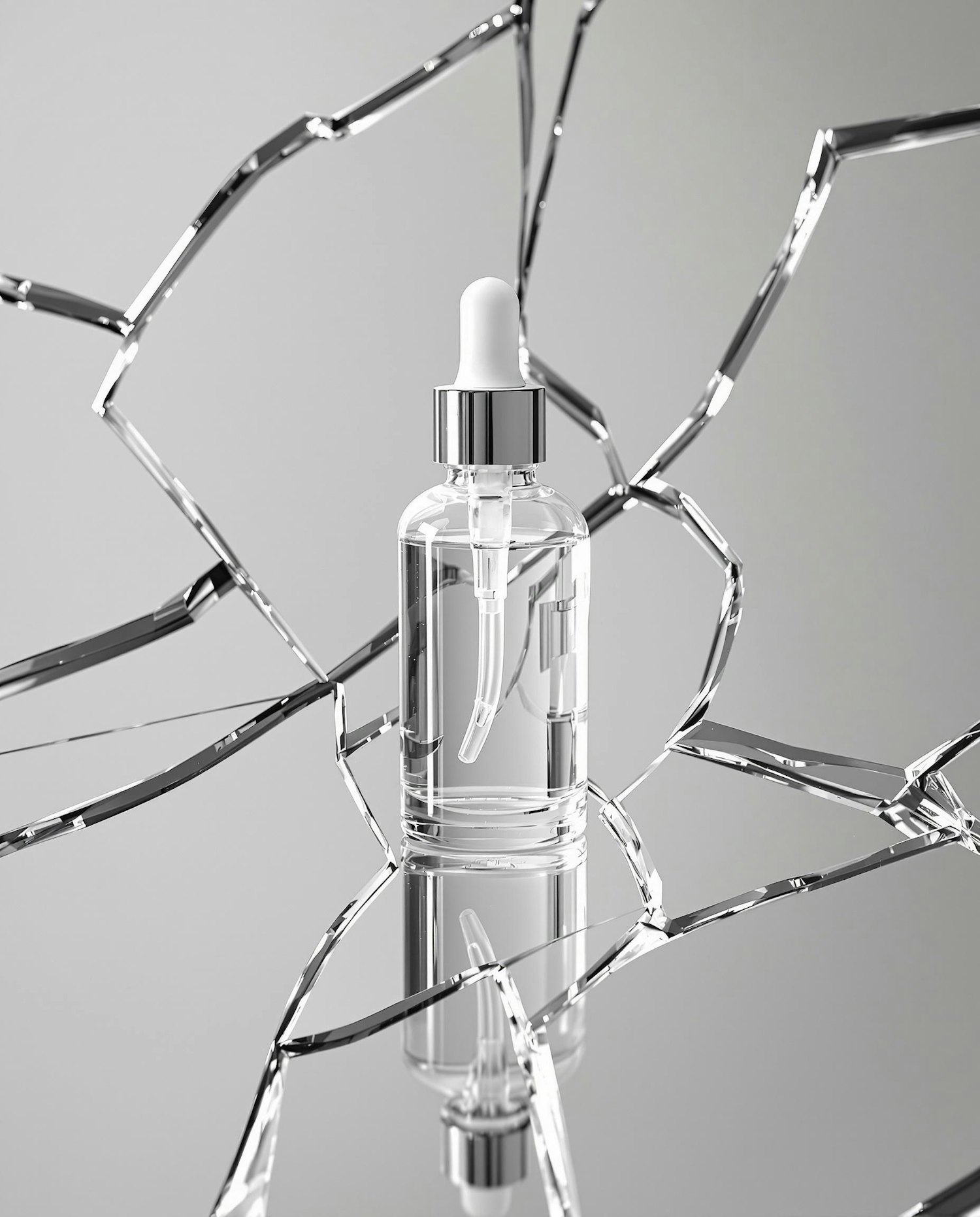 A blank transparent glass dropper bottle placed in front of a large broken mirror laying flat. The reflection fragments the image. The bottle is centered and clean. Studio light adds contrast and reflections on the glass, while the mirror surface creates distortion and tension. High-fashion editorial vibe.