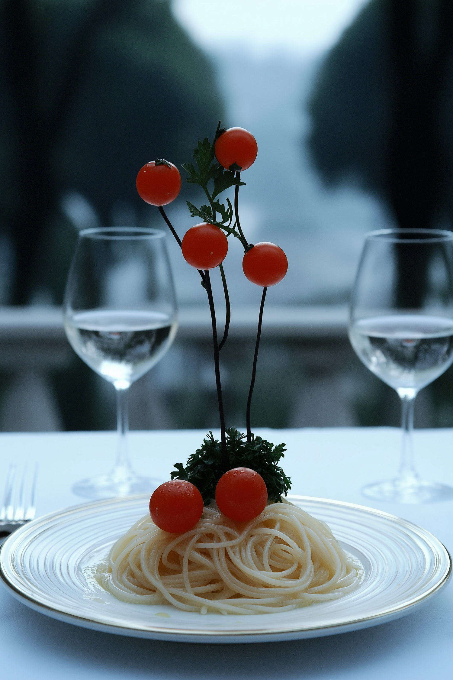 Artistic spaghetti dish with cherry tomatoes and parsley, flanked by wine glasses on a white tablecloth, set in an elegant outdoor setting.