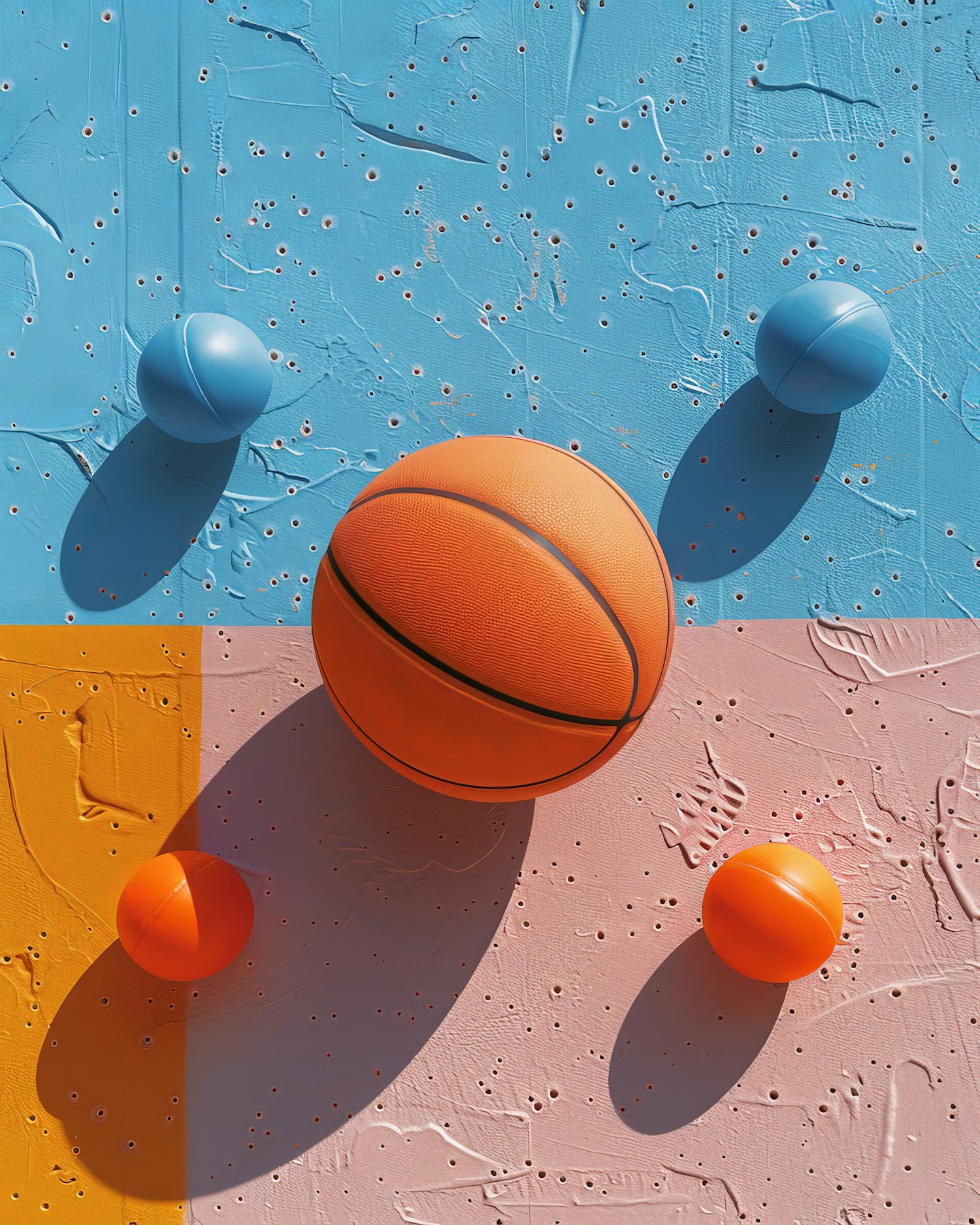 Colorful composition with a basketball and smaller balls on a textured, multicolored background. Vibrant and artistic design.