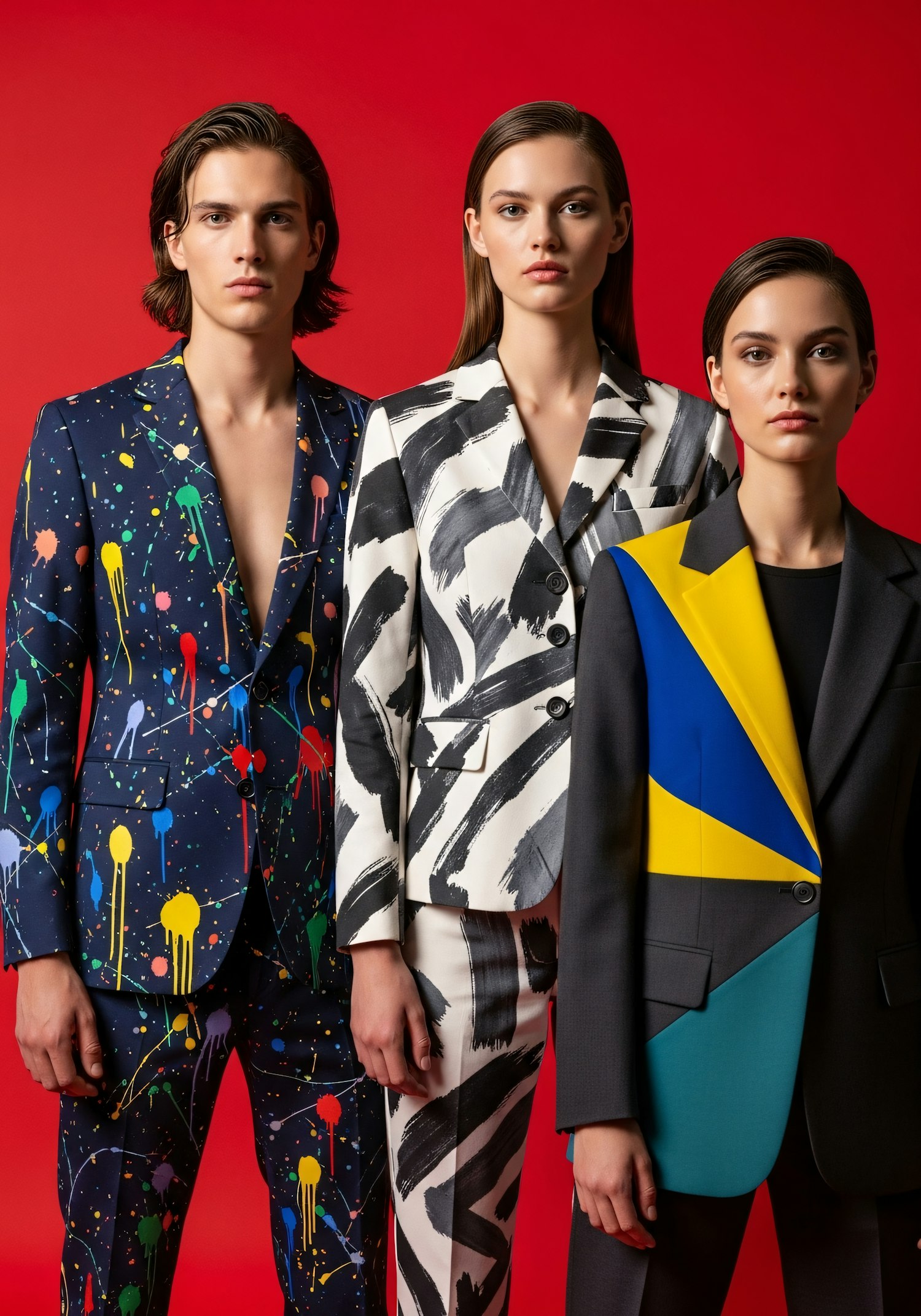 Three individuals in artistic suits with bold patterns and colors stand against a vibrant red background, showcasing modern fashion.