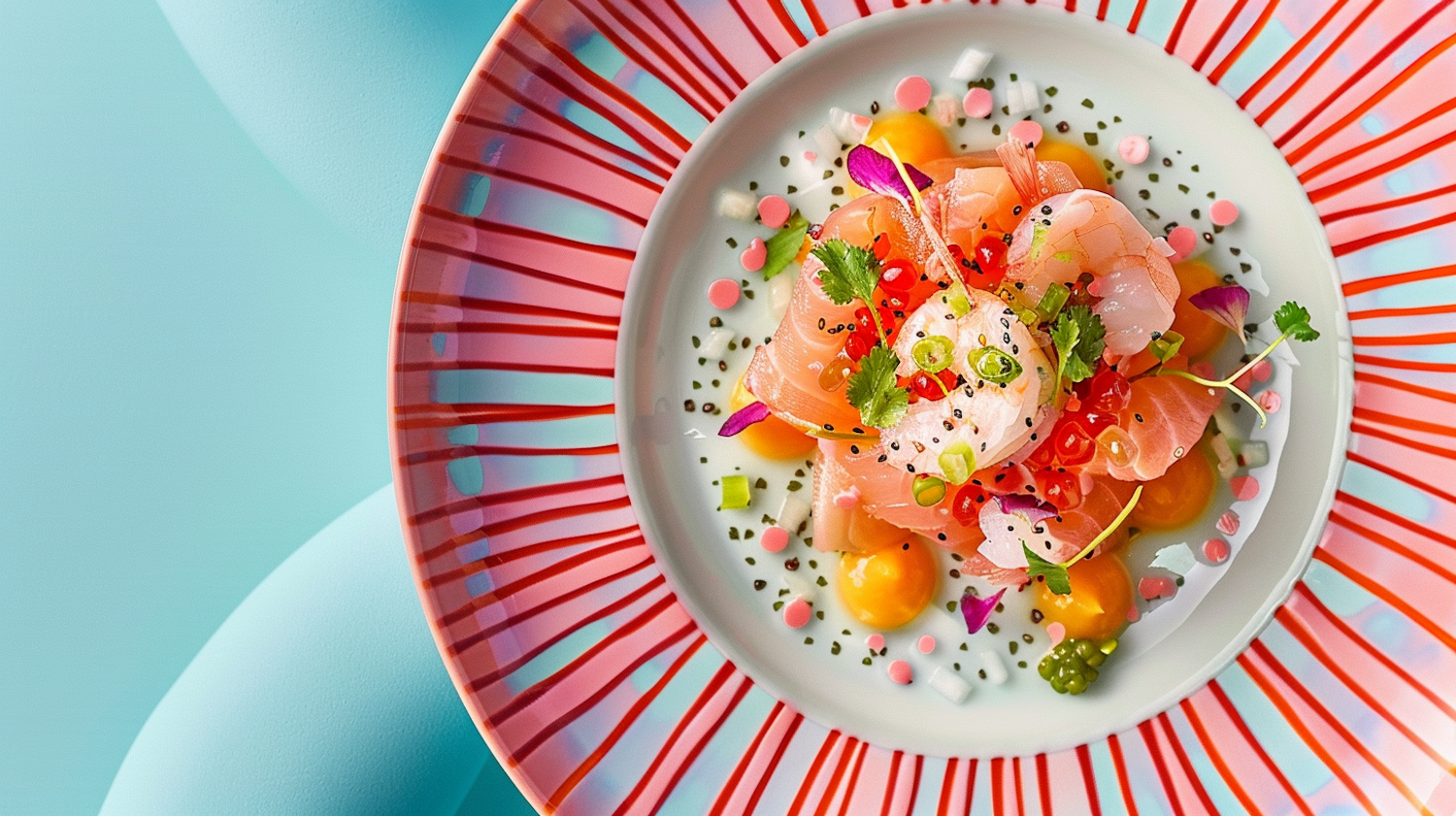 Vibrant dish with raw fish, herbs, and roe on a red-striped plate against a turquoise background.