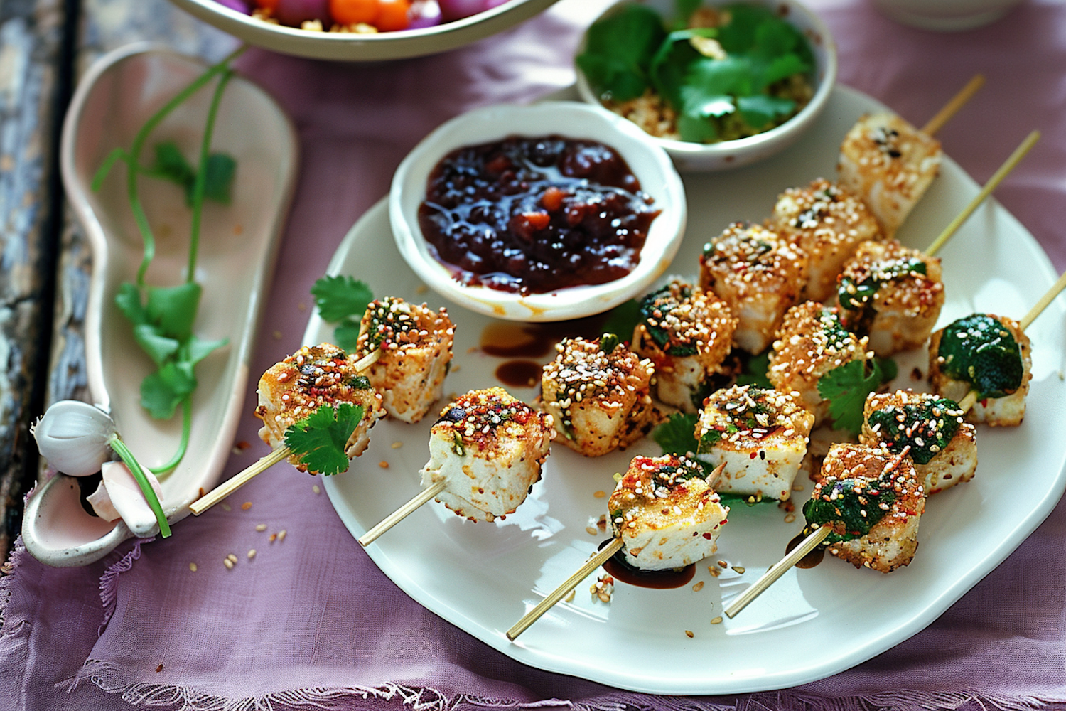 Skewered tofu with sesame seeds and spinach, served with a rich dipping sauce on a lavender cloth. Fresh cilantro and garlic add flavor.