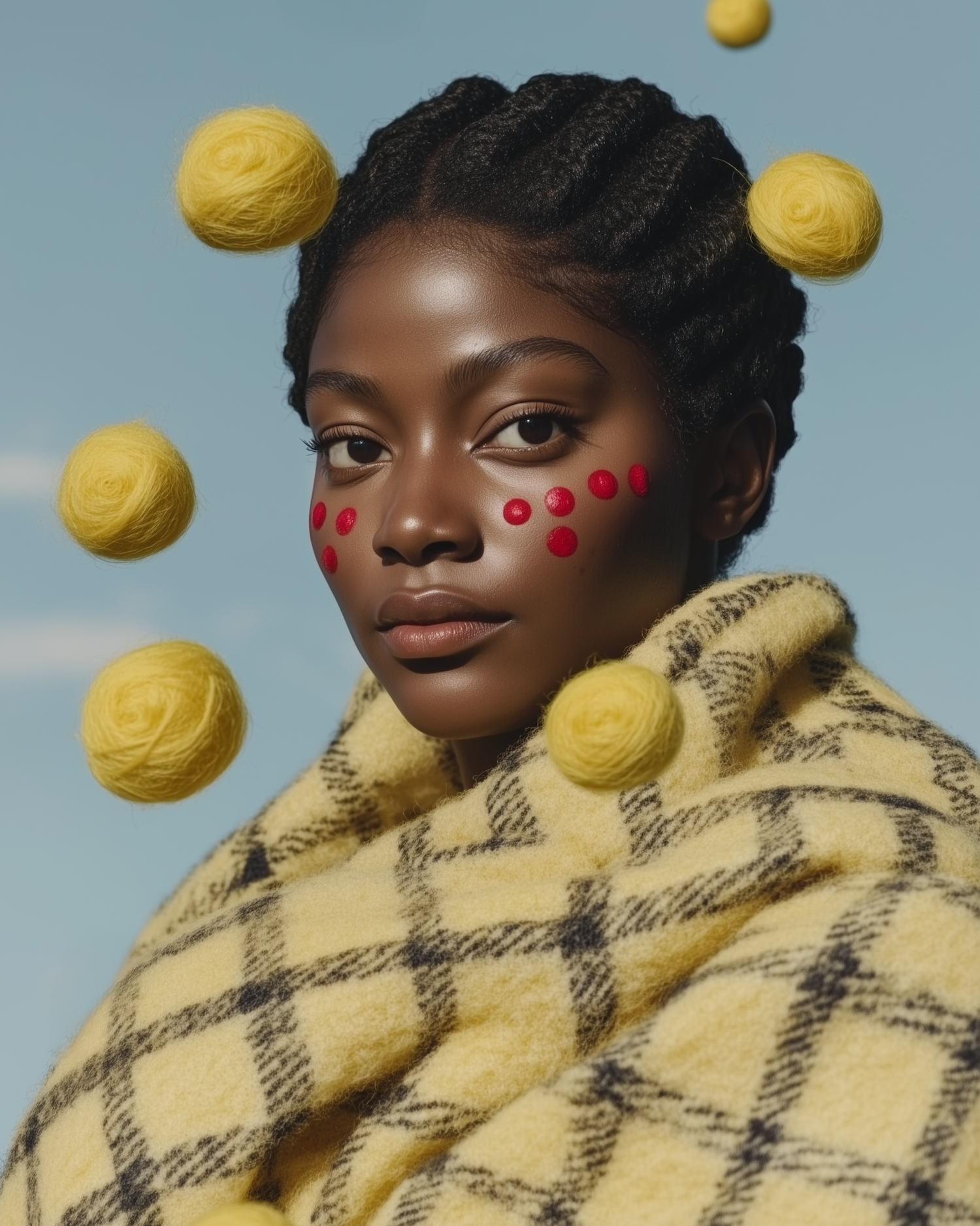 Artistic portrait of a woman with red cheek dots, yellow plaid wrap, and floating yarn balls against a clear blue sky.