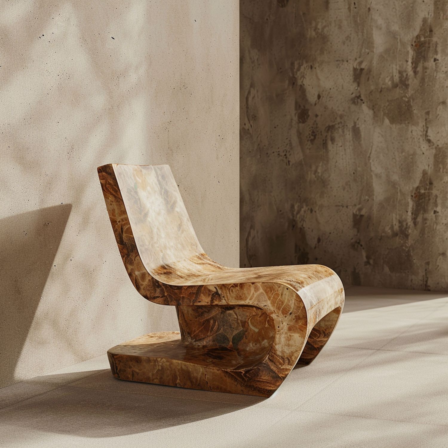Sculptural marble chair with sleek curves in a minimalist setting, featuring textured walls and soft natural light.