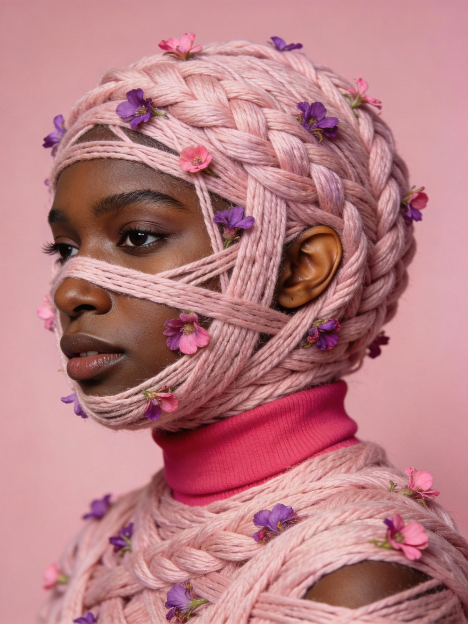 A Black woman’s body is fully wrapped in thick, sculptural pink yarn, with small purple-pink flowers delicately interspersed throughout the layers. Her ear is partially visible, hinting at the human presence beneath the cocoon-like textile. She wears a pink turtleneck that contrasts sharply with the soft pink tones, grounding the composition in quiet strength. The background is a solid pink hue that matches the yarn, creating a monochromatic field of warmth and concealment. The lighting is soft and even, emphasizing the yarn’s texture, the floral accents, and the gentle contours of her skin. The mood is tender and surreal, blending themes of transformation, identity, and emotional softness. Hyperrealistic rendering should focus on yarn layering, floral placement, skin detail, and tonal harmony across the garment, accessory, and background.