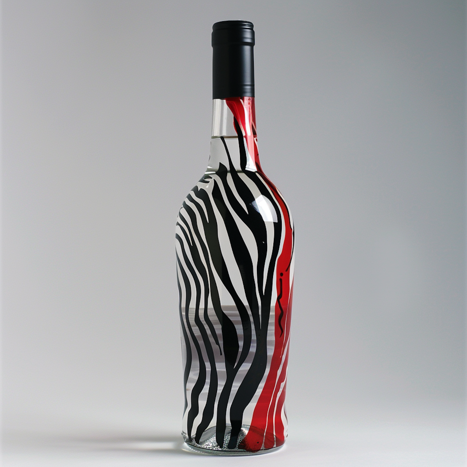 Stylish glass bottle with zebra stripes and a splash of red, featuring a matte black cap against a neutral background.
