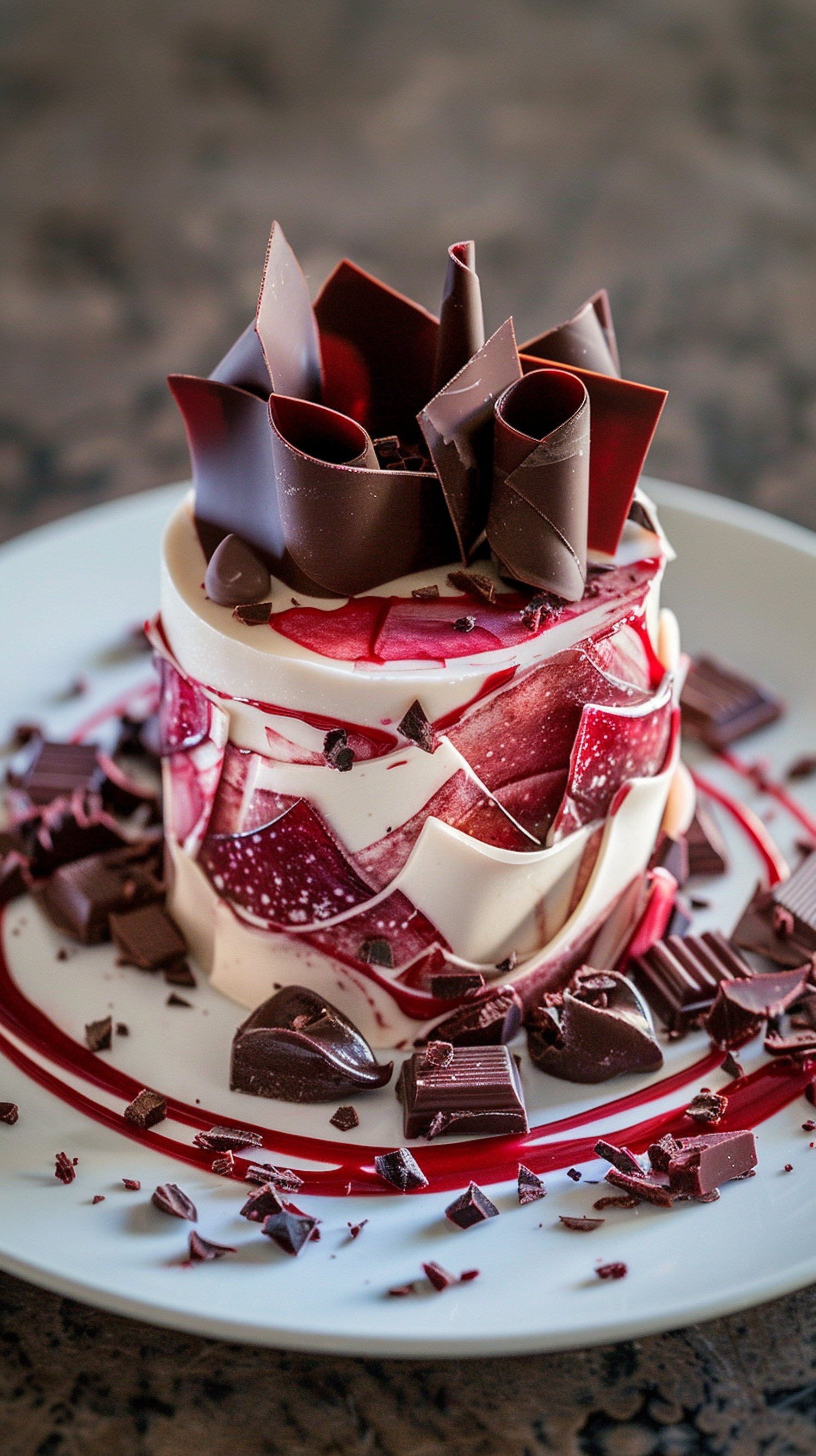 Elegant cake with chocolate curls, marbled red and white design, and dark chocolate chunks on a white plate.