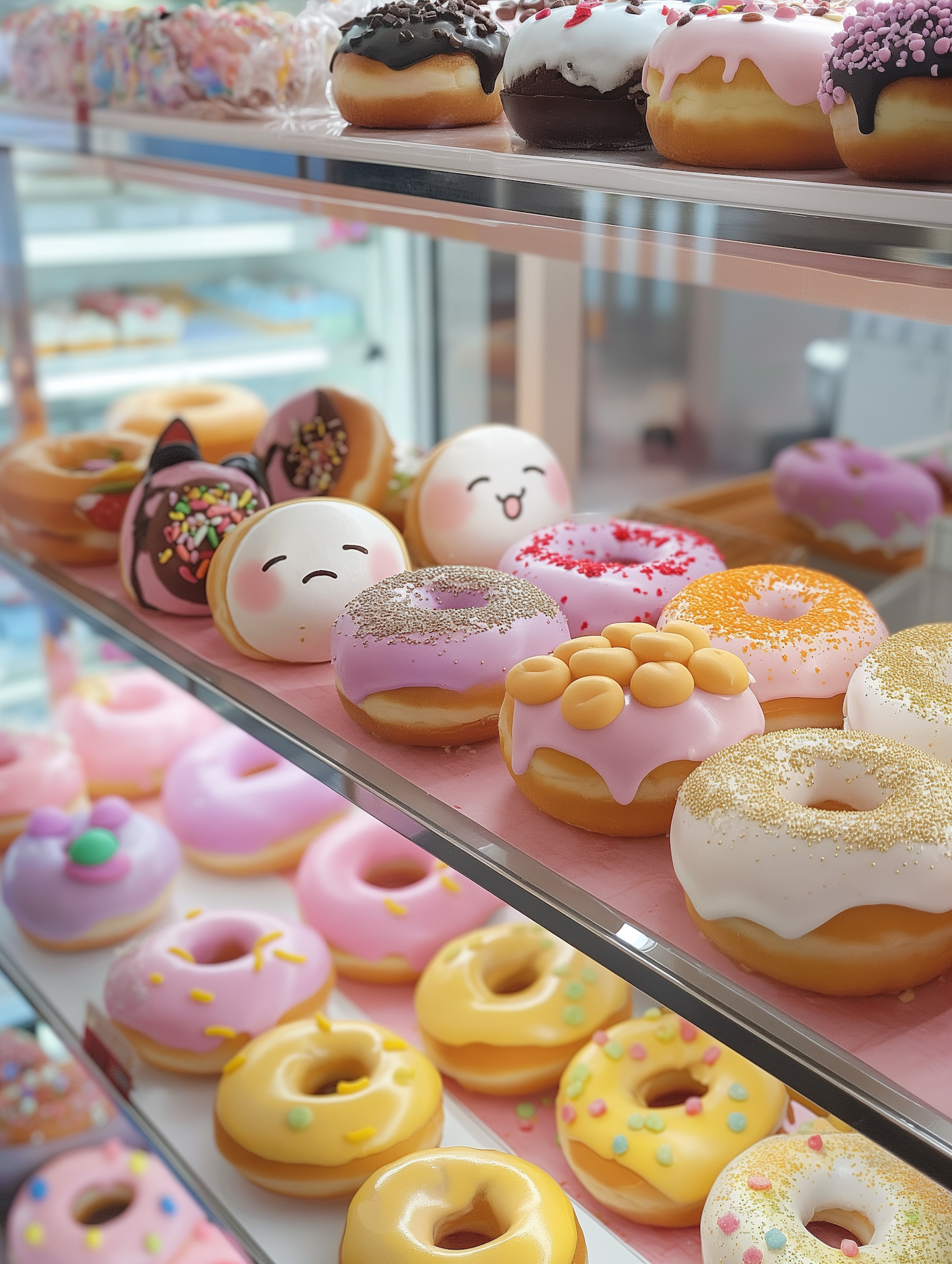 A vibrant display of colorful donuts with playful designs and sprinkles, perfect for a sweet treat or dessert inspiration.