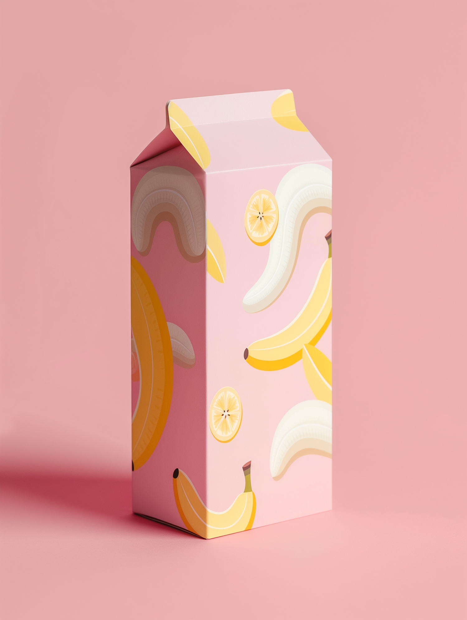 Pastel pink carton with banana and lemon illustrations on a matching pink background, creating a playful and vibrant design.