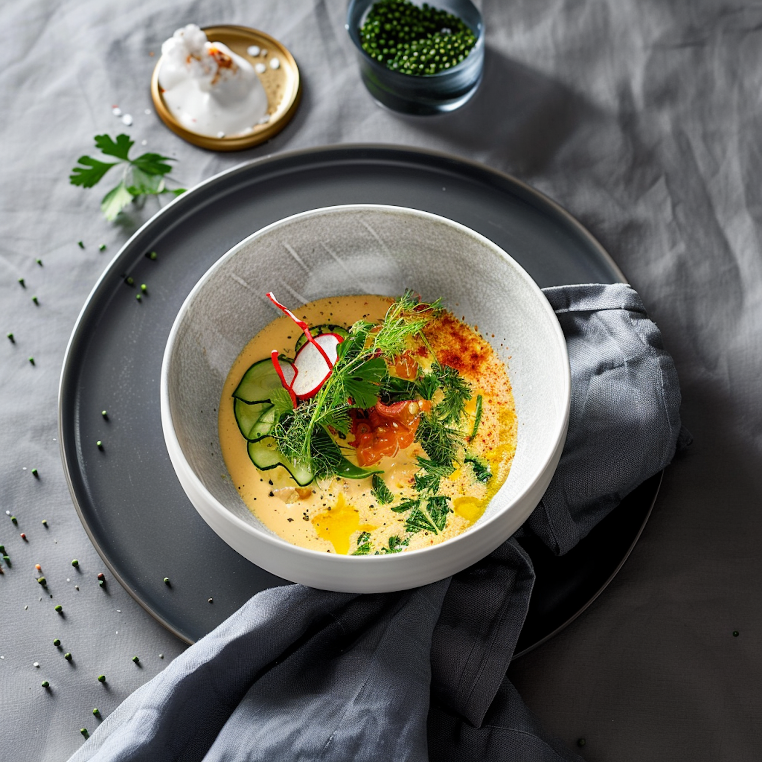 Elegant creamy soup garnished with herbs, cucumber, radish, fish roe, and paprika, served in a white bowl on a gray plate.