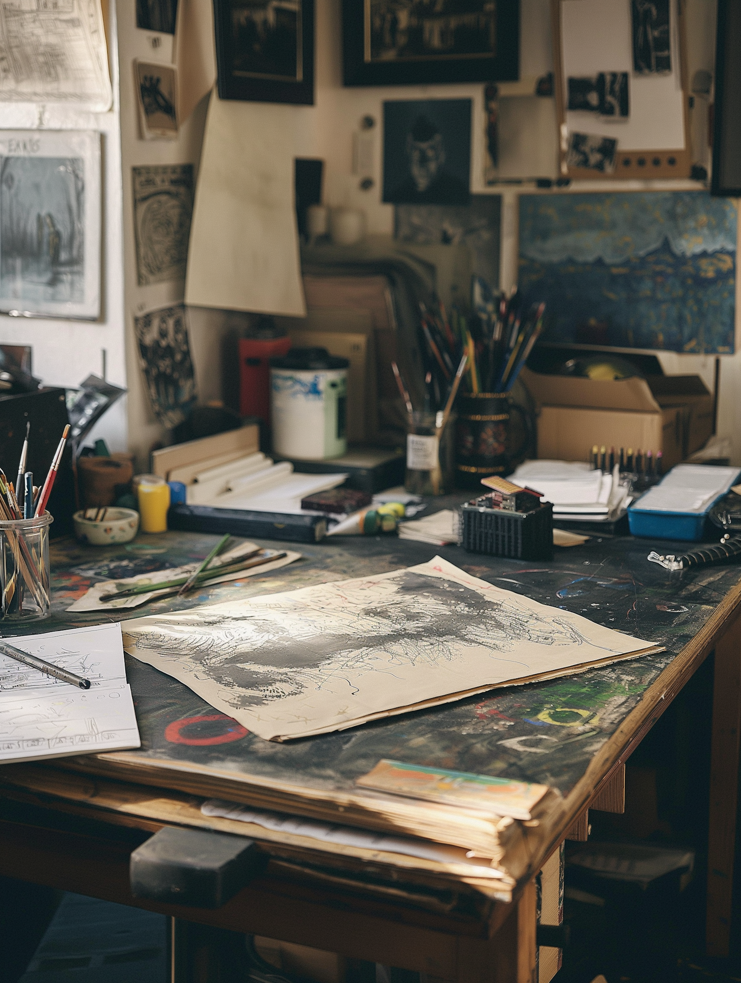 Artist's workspace with sketches, brushes, and art supplies on a cluttered table, surrounded by framed artworks and pinned sketches.