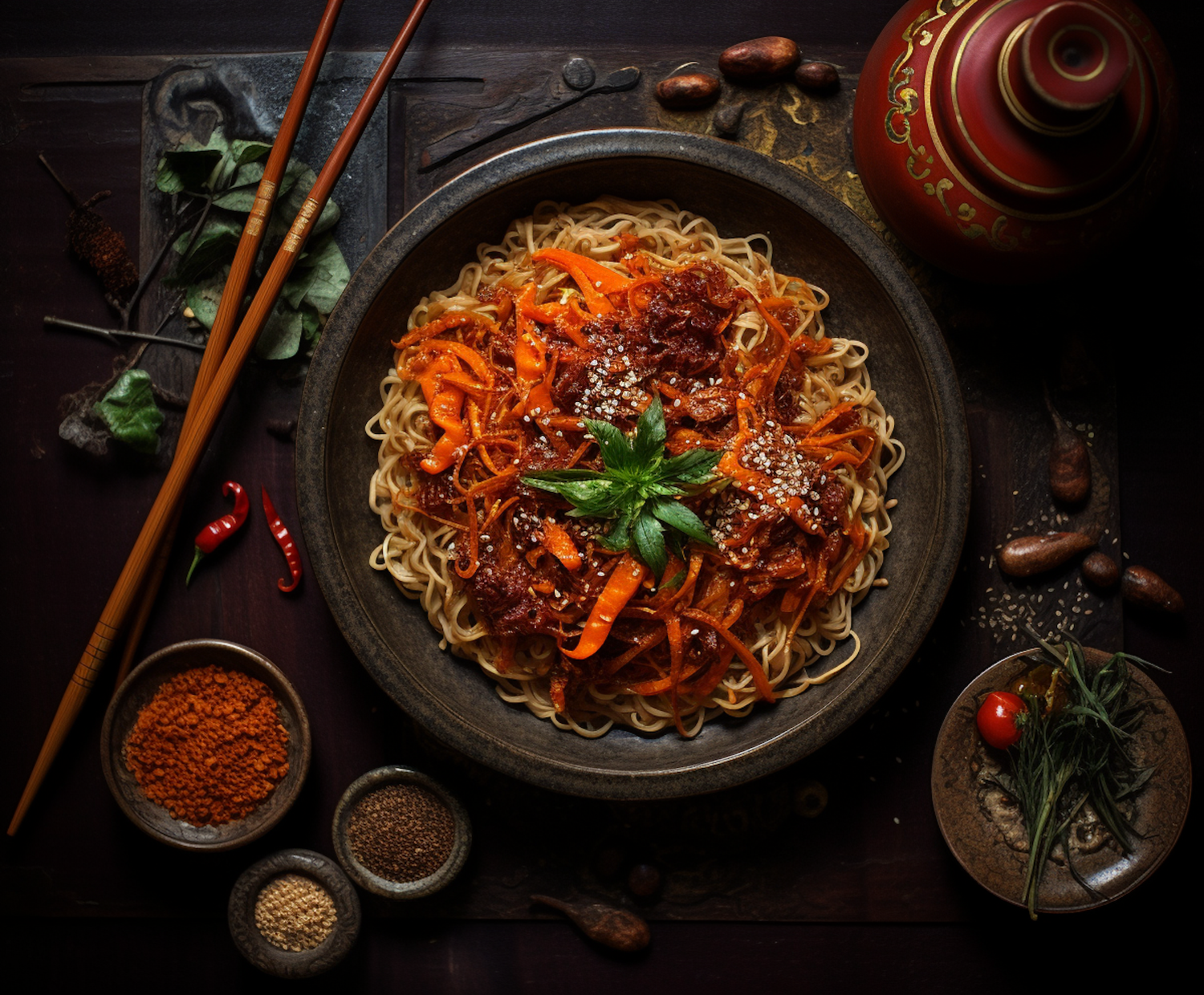 Delicious noodles with vibrant carrots and rich sauce, garnished with sesame seeds. Surrounded by spices and chopsticks on a rustic table.