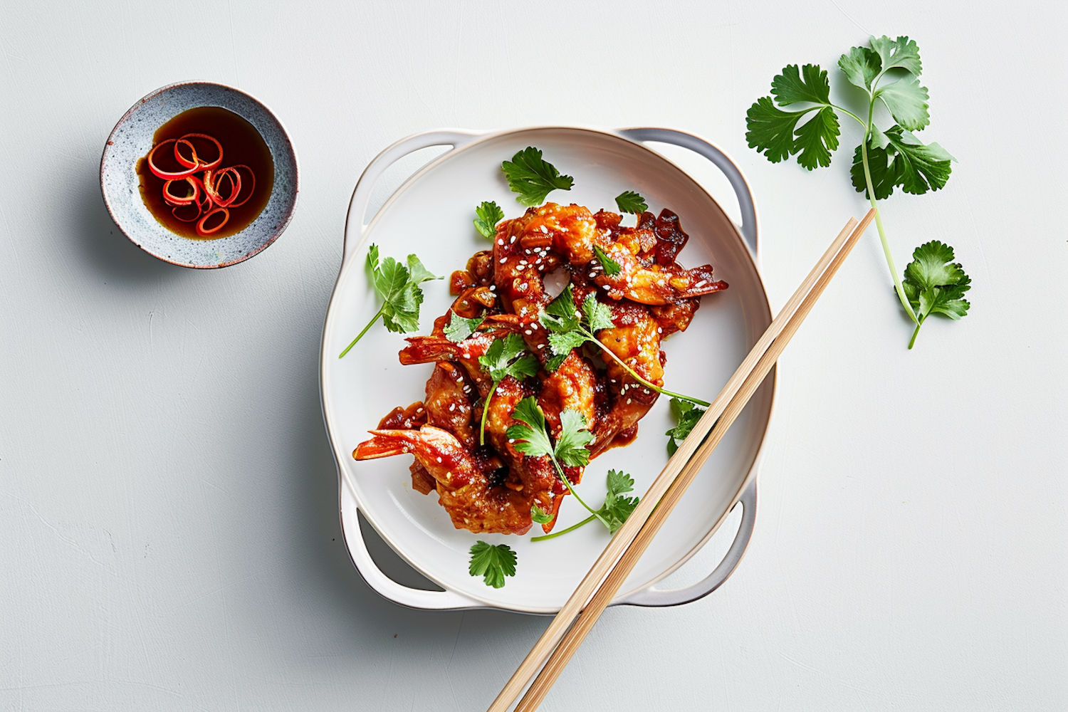 Glazed shrimp with cilantro and sesame seeds, served with a soy-chili dipping sauce and chopsticks on a light background.