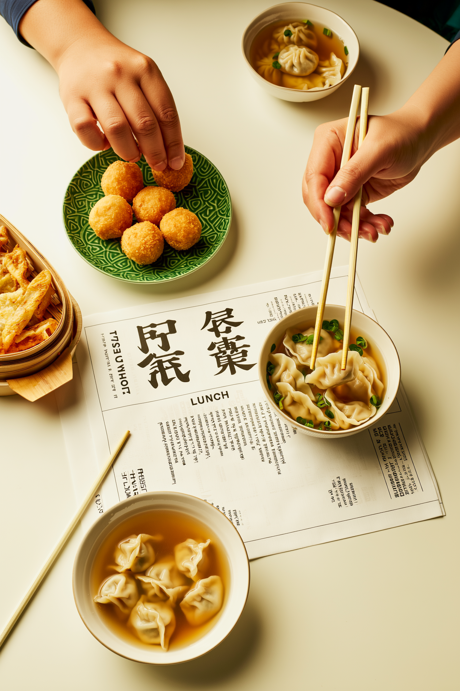 A vibrant table setting with dumplings, fried snacks, and soup, showcasing a delicious Asian-inspired meal in a bright, inviting atmosphere.