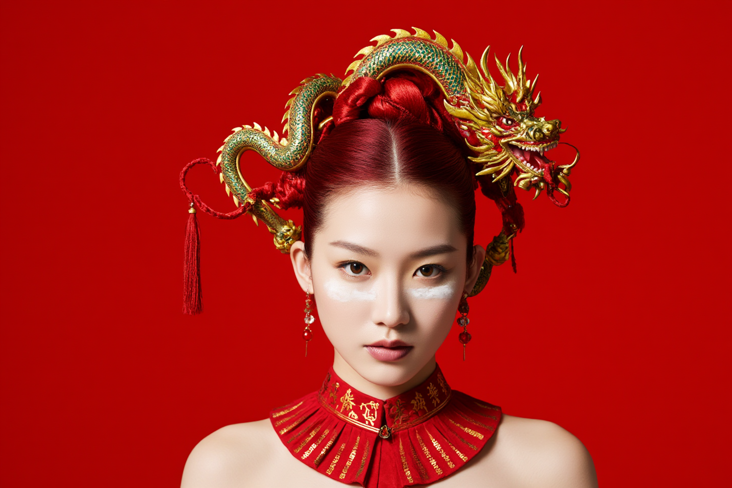 Elegant portrait of a woman in a golden dragon headpiece, red attire, and bold makeup, set against a vivid red background.