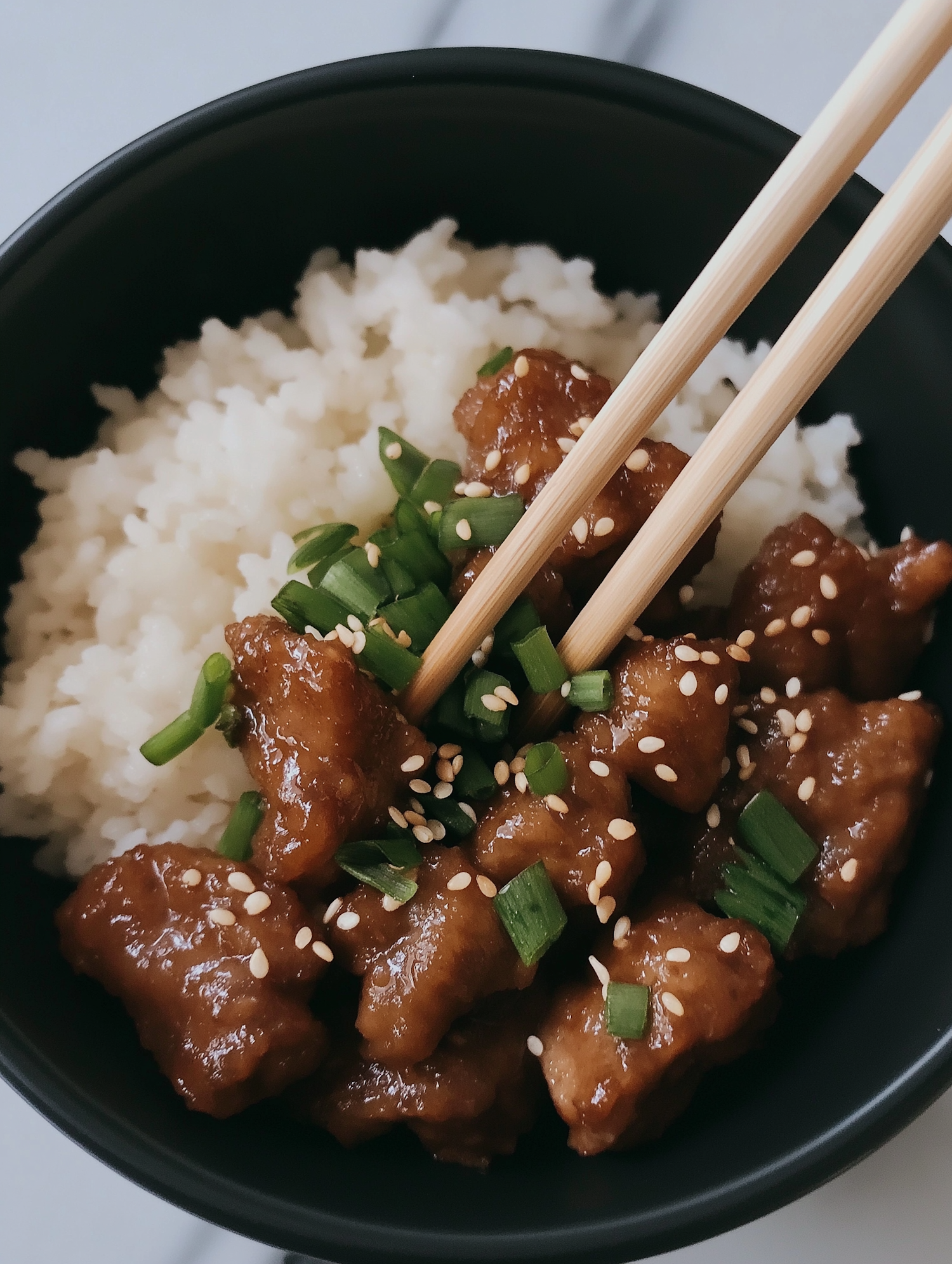 Delicious glazed chicken with sesame seeds and green onions served over white rice in a black bowl with chopsticks.