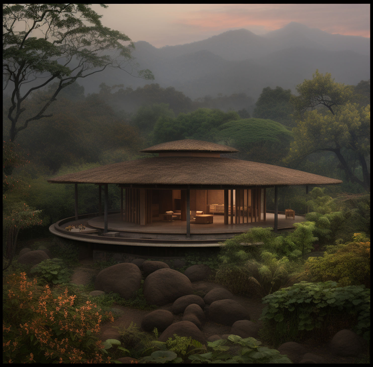 Circular thatched-roof house in lush greenery with misty mountains in the background, creating a serene and harmonious atmosphere.