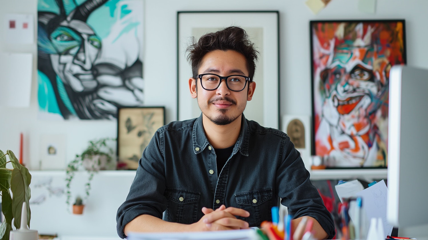 Asian man with glasses in a creative workspace, surrounded by colorful abstract art and stationery on a cluttered desk.