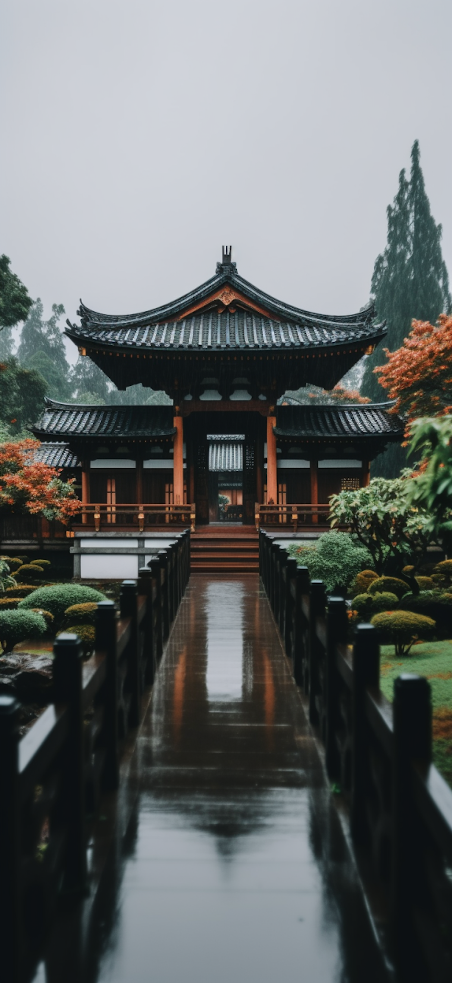 Serene Japanese temple with pagoda roof, surrounded by lush greenery and autumn foliage, reflecting on a wet pathway.