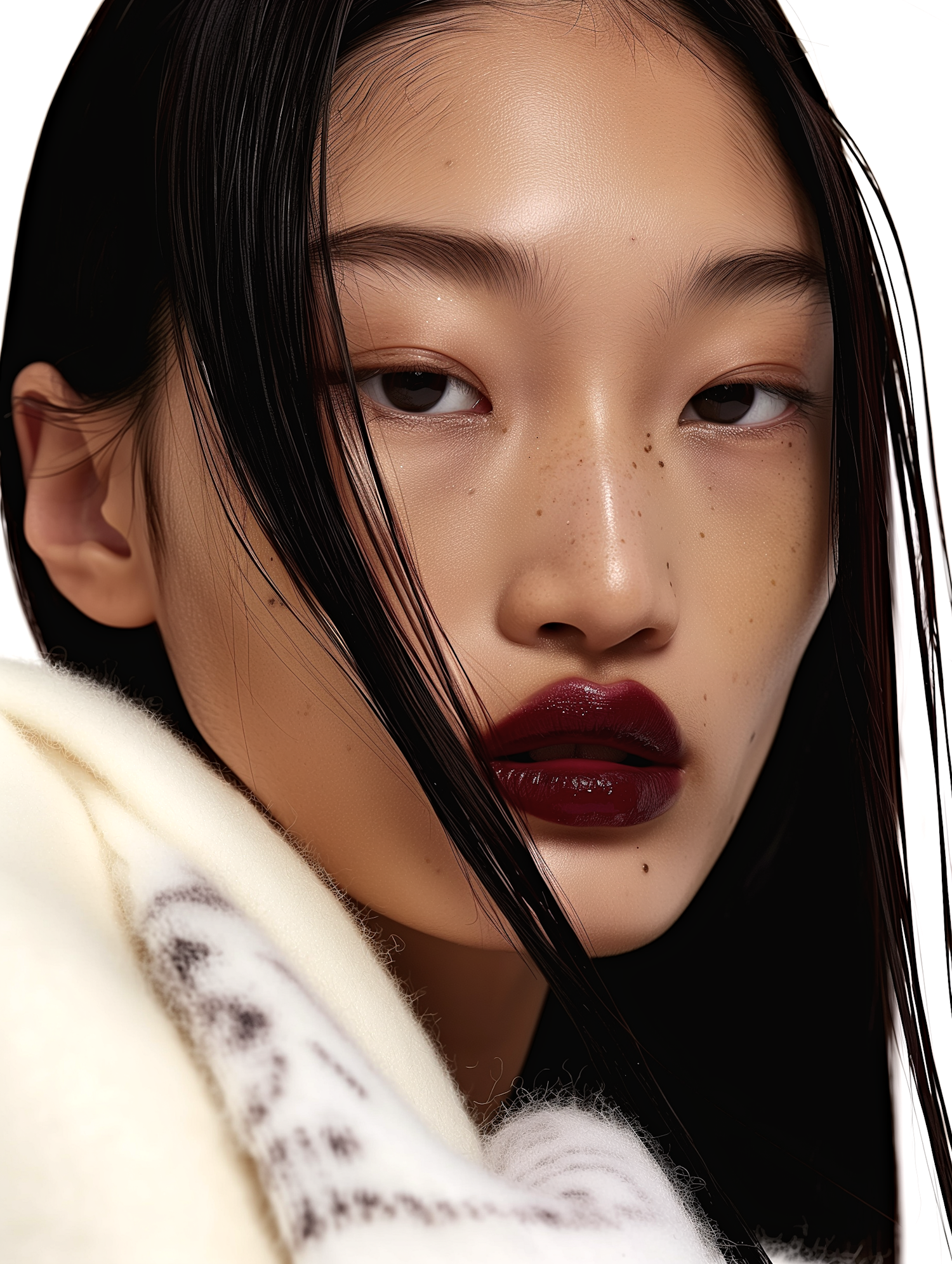 Close-up of an Asian woman with sleek black hair, glossy burgundy lips, and natural freckles, wearing a white patterned scarf.