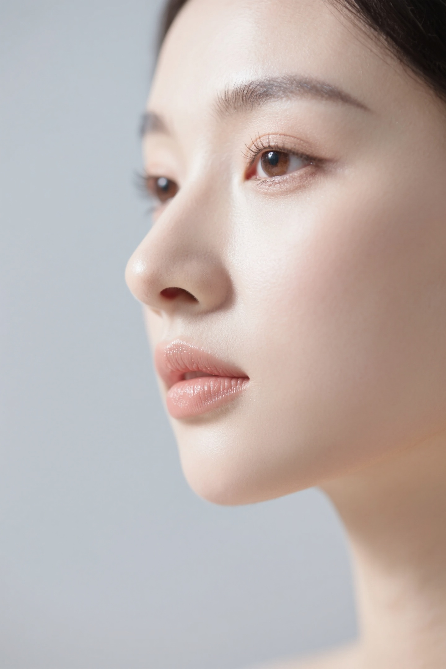 Close-up side profile of a woman with glowing skin, natural makeup, and soft lighting against a neutral gray background.