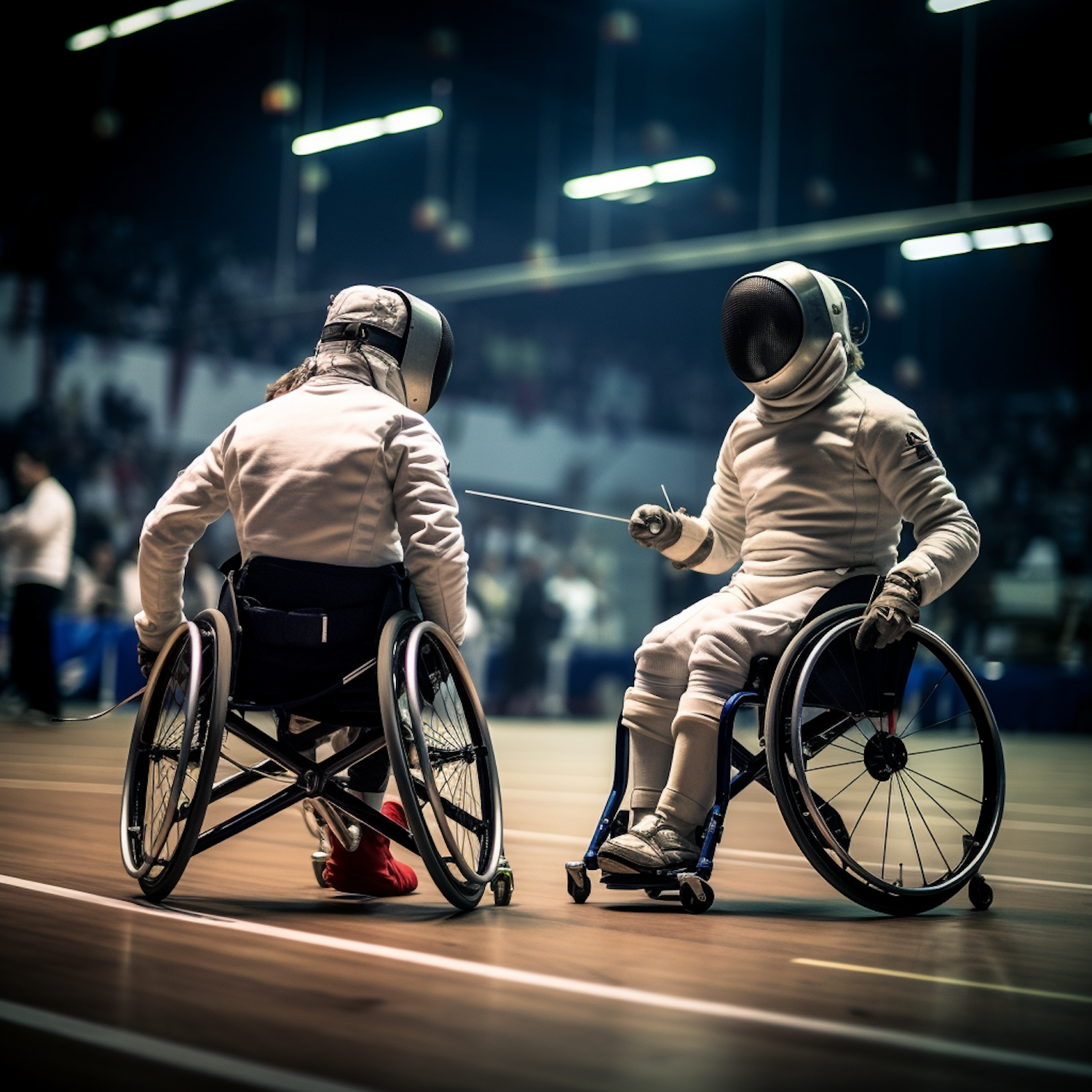 Two wheelchair fencers in action, showcasing skill and intensity in a competitive indoor arena setting.