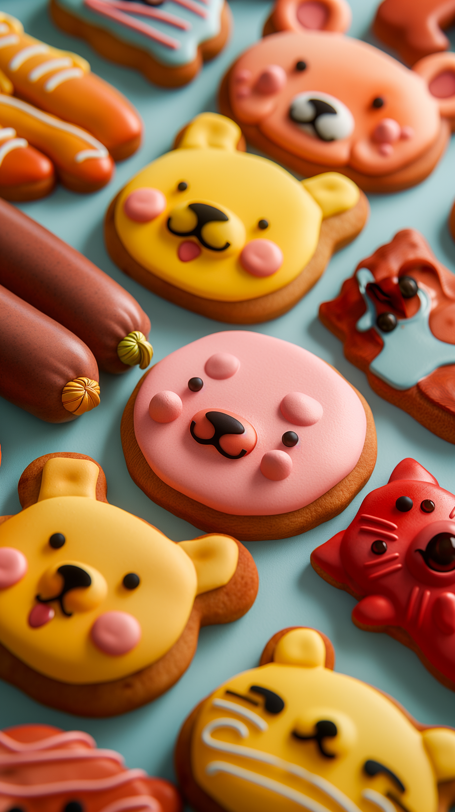 Colorful animal-shaped cookies with vibrant icing on a light blue background, featuring bears and playful designs.