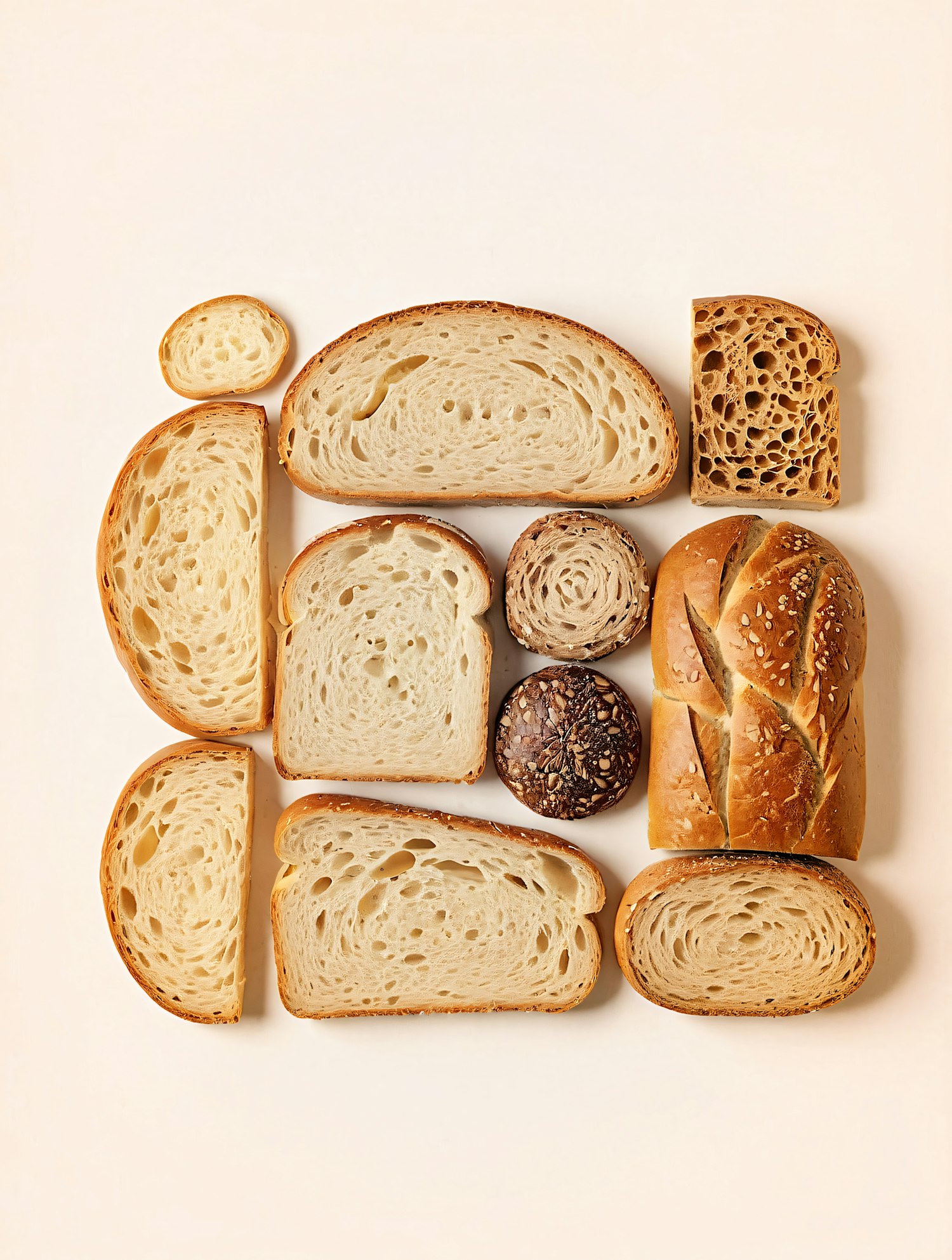A beautiful assortment of bread slices and rolls arranged in a grid, showcasing textures, crusts, and crumb structures on a beige background.