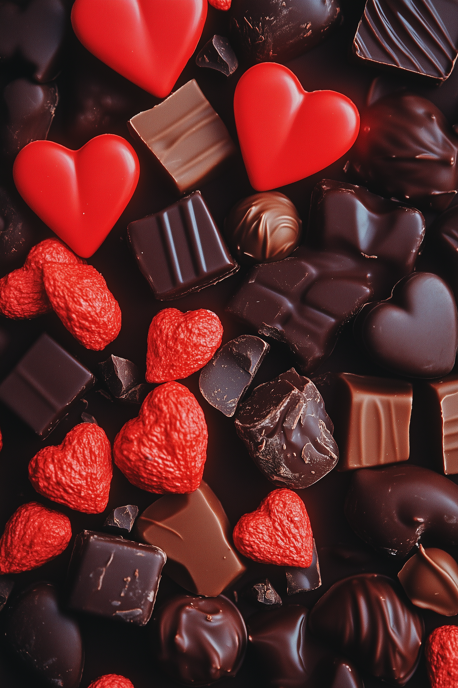 Assorted heart-shaped chocolates and candies in rich browns and vibrant reds, creating a romantic and indulgent scene.