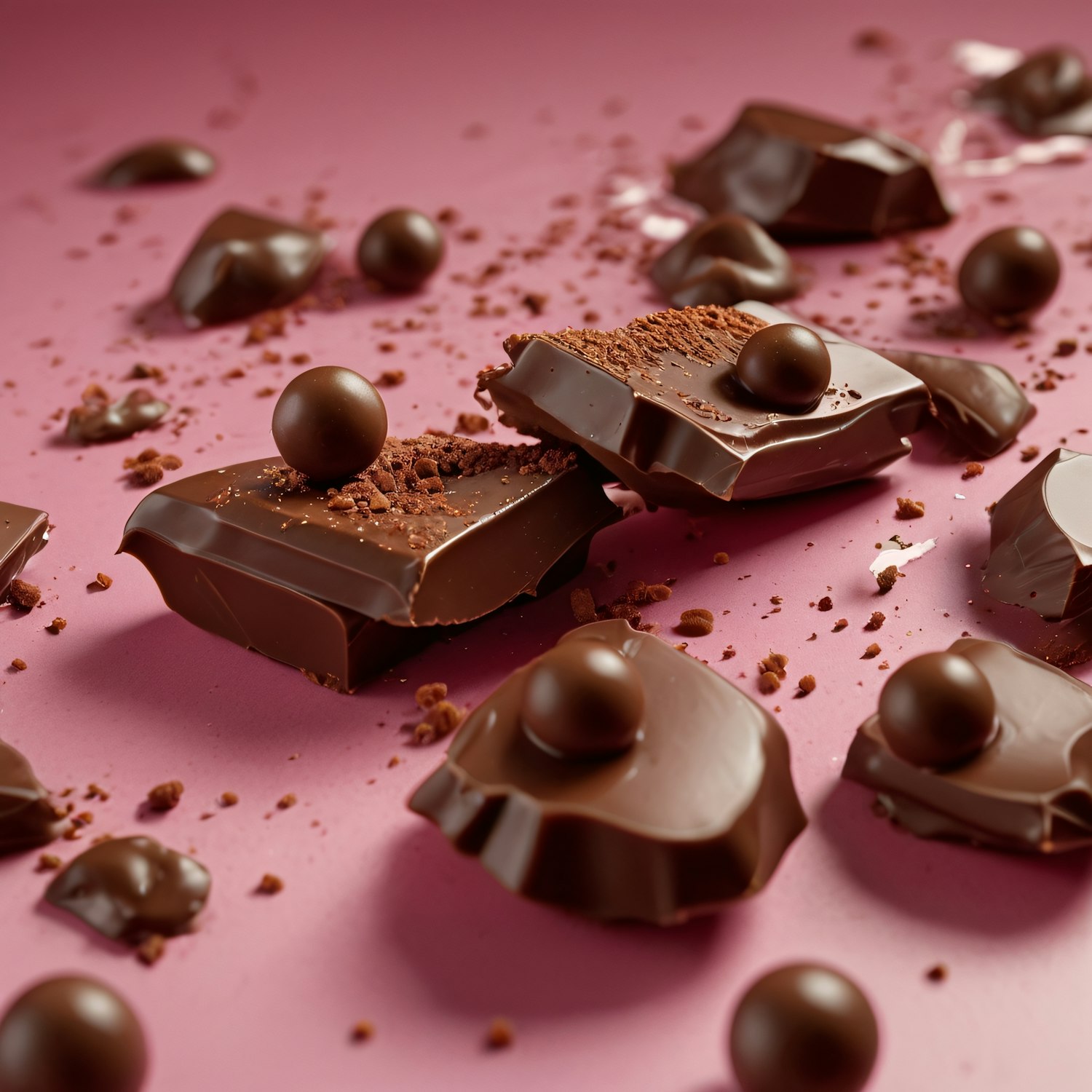 Irregular dark chocolate pieces with round chocolate balls on a pink surface, creating a rich and indulgent visual contrast.