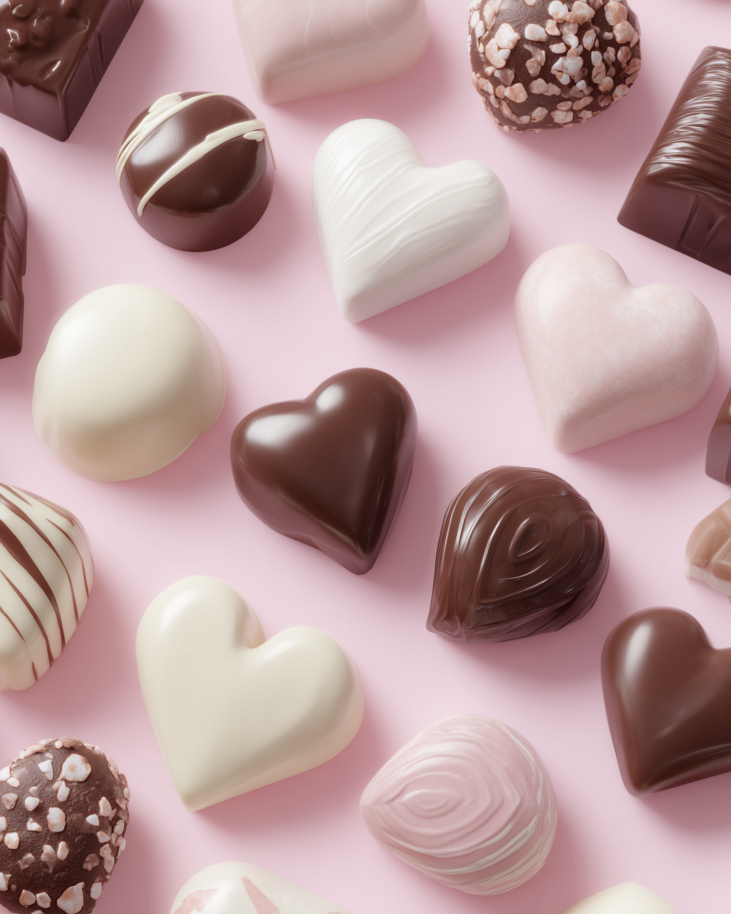 A beautiful assortment of heart-shaped and round chocolates in white, milk, and dark varieties, arranged on a pastel pink background.
