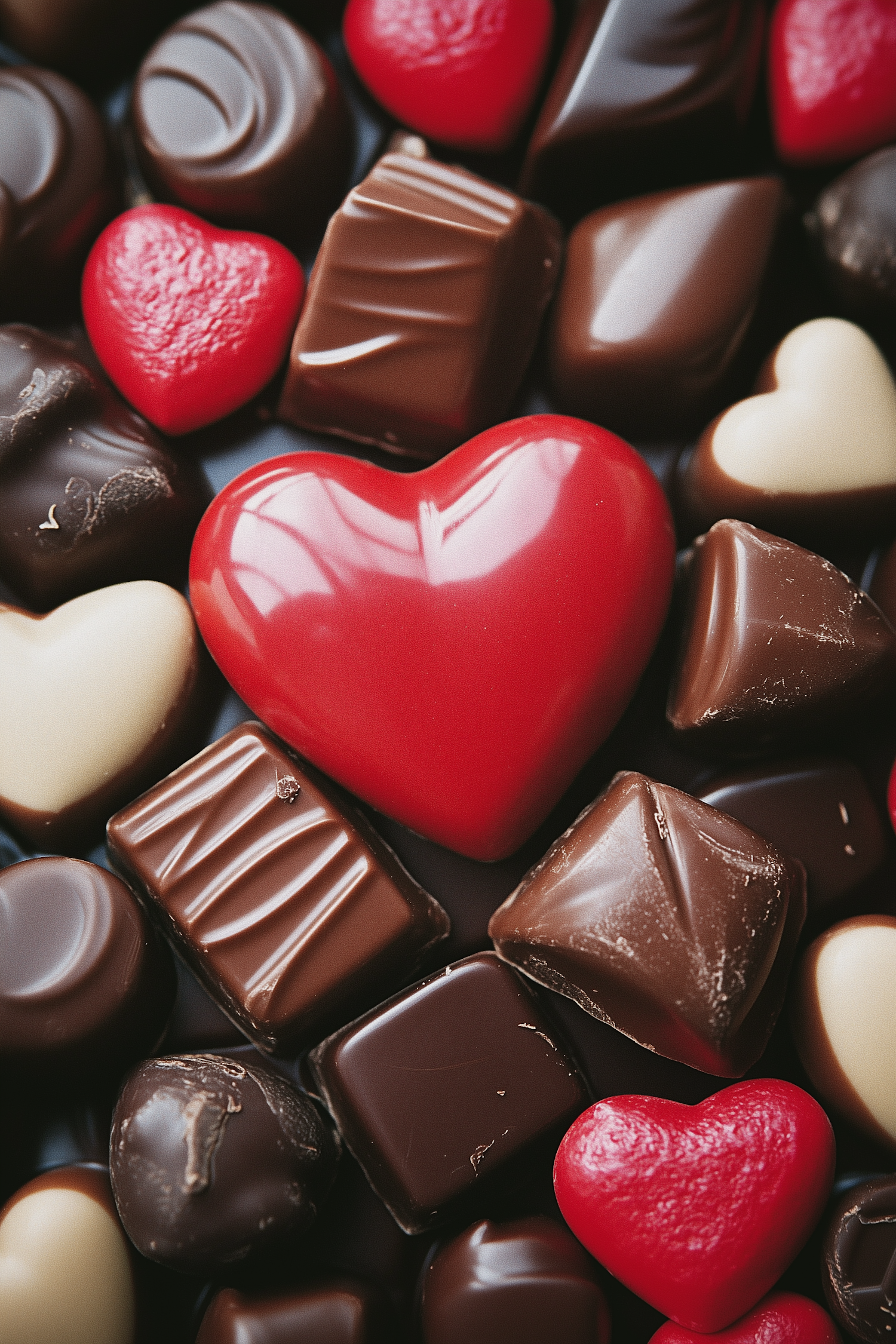 Assorted chocolates with a glossy red heart centerpiece, surrounded by dark, milk, and white varieties in various shapes.