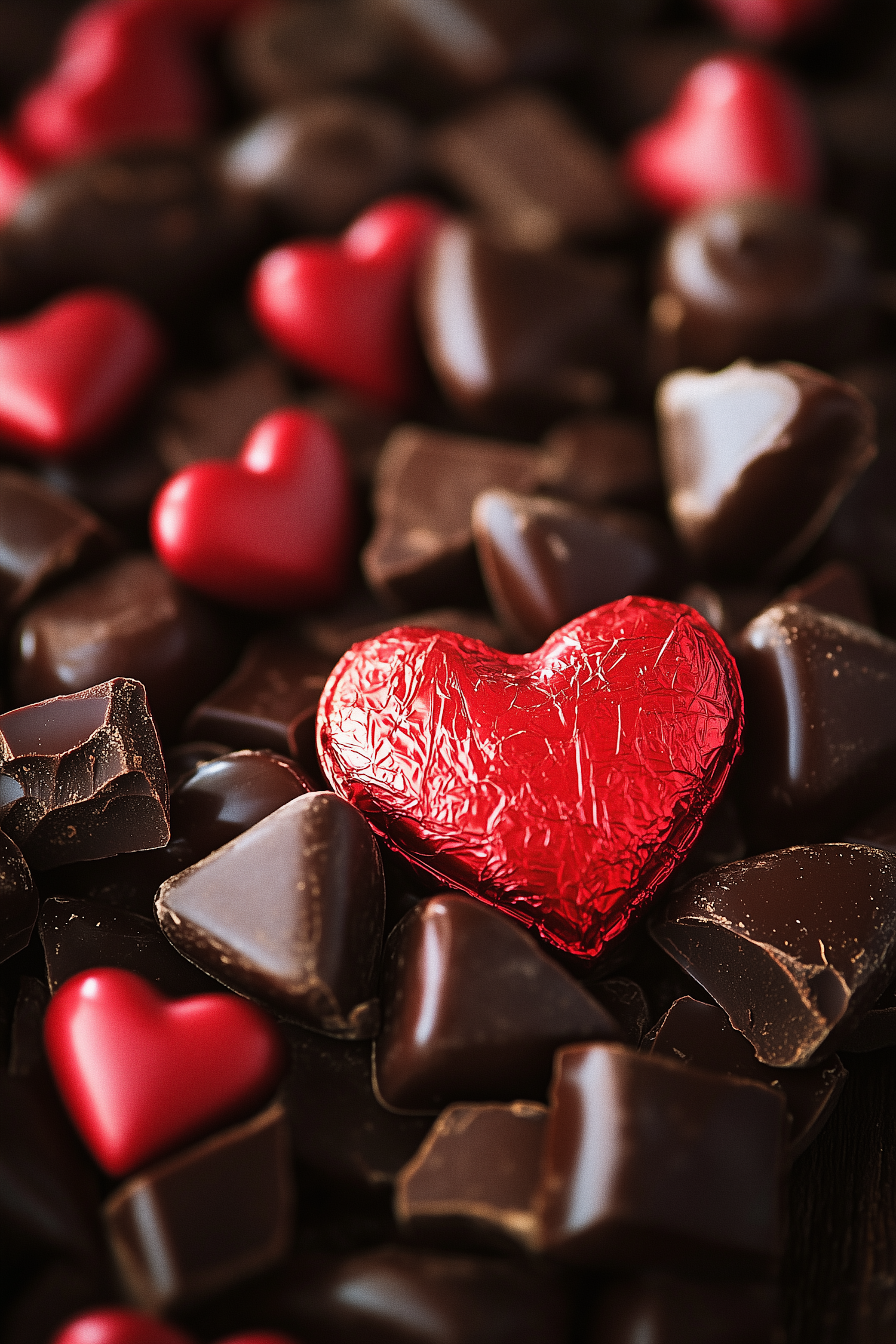 Heart-shaped chocolates and red candies create a rich, indulgent scene with a standout red foil-wrapped chocolate.