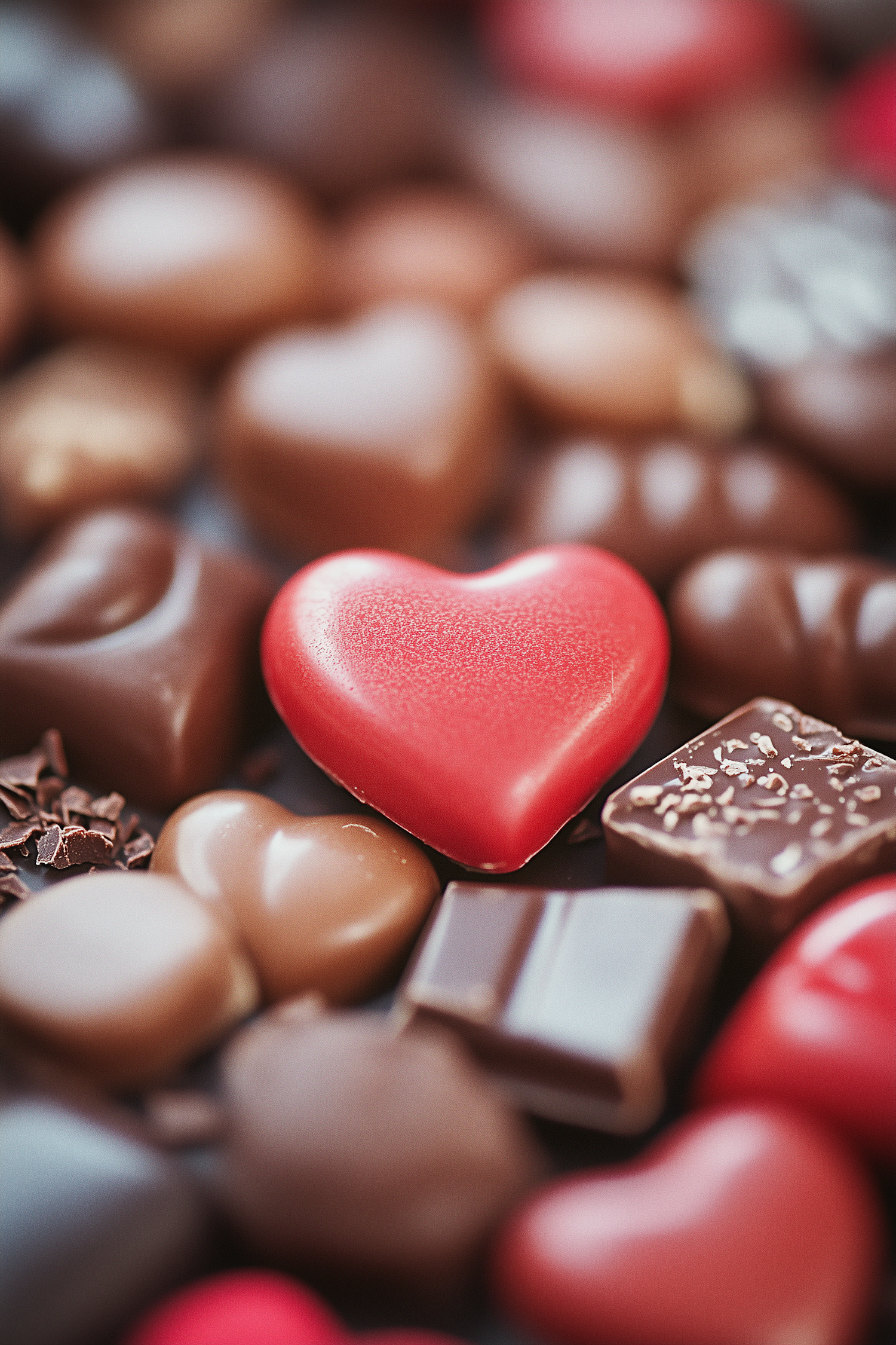 Close-up of assorted chocolates with a standout red heart-shaped piece, surrounded by various brown chocolates.