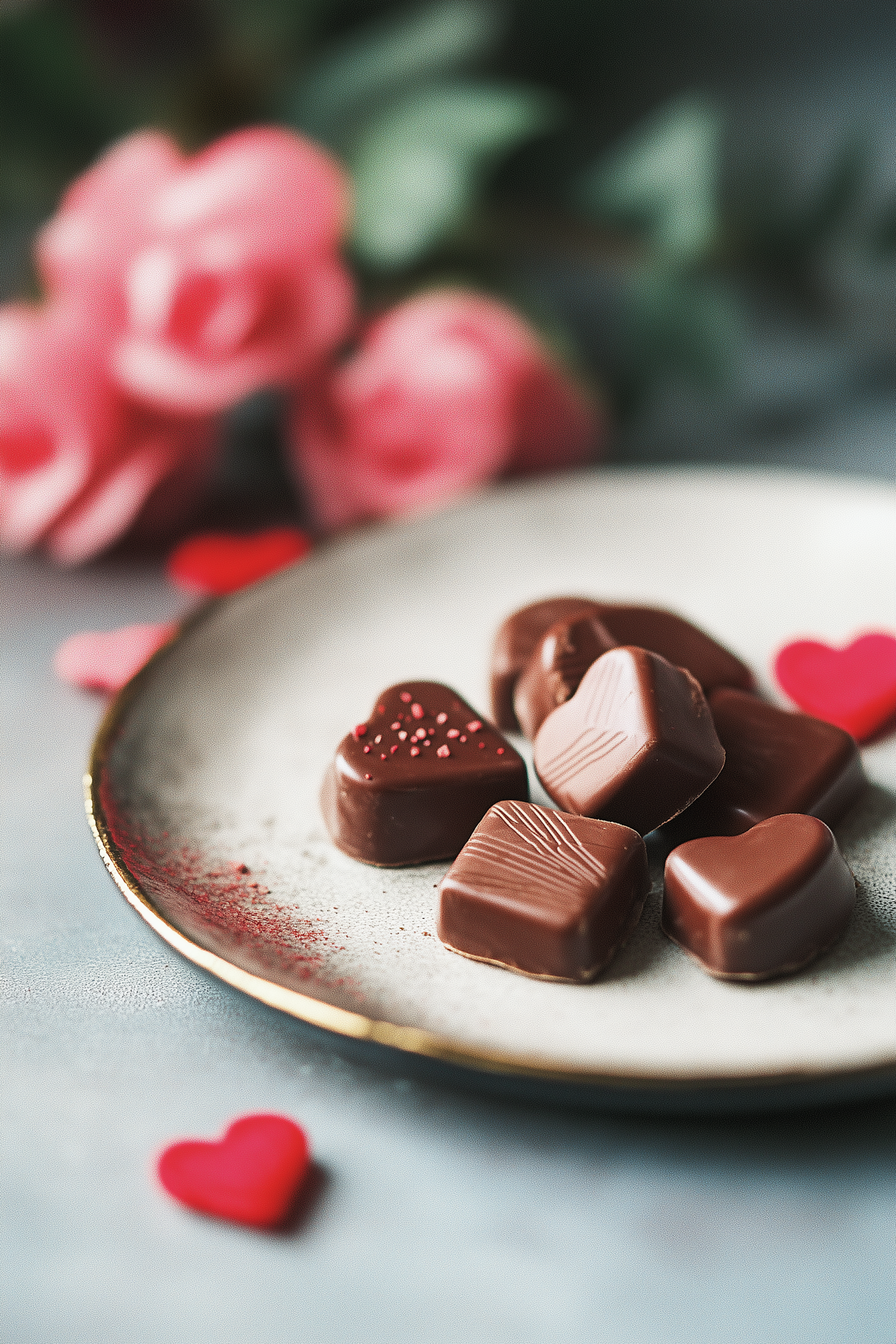 Assorted heart-shaped chocolates on a plate with pink roses and red hearts, creating a romantic and elegant setting.