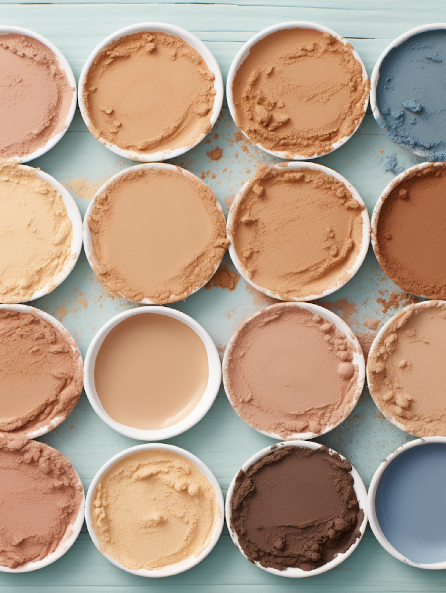 Diverse makeup powders in round containers on a blue surface, showcasing a range of shades from beige to dark brown and a unique blue.