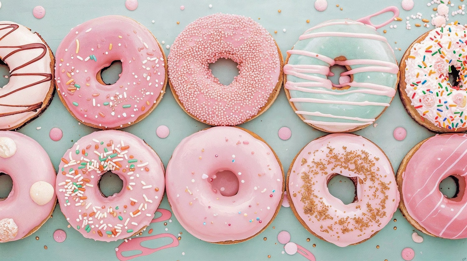 Colorful donuts with pink, mint, and chocolate icing, topped with sprinkles, arranged on a pastel blue background.
