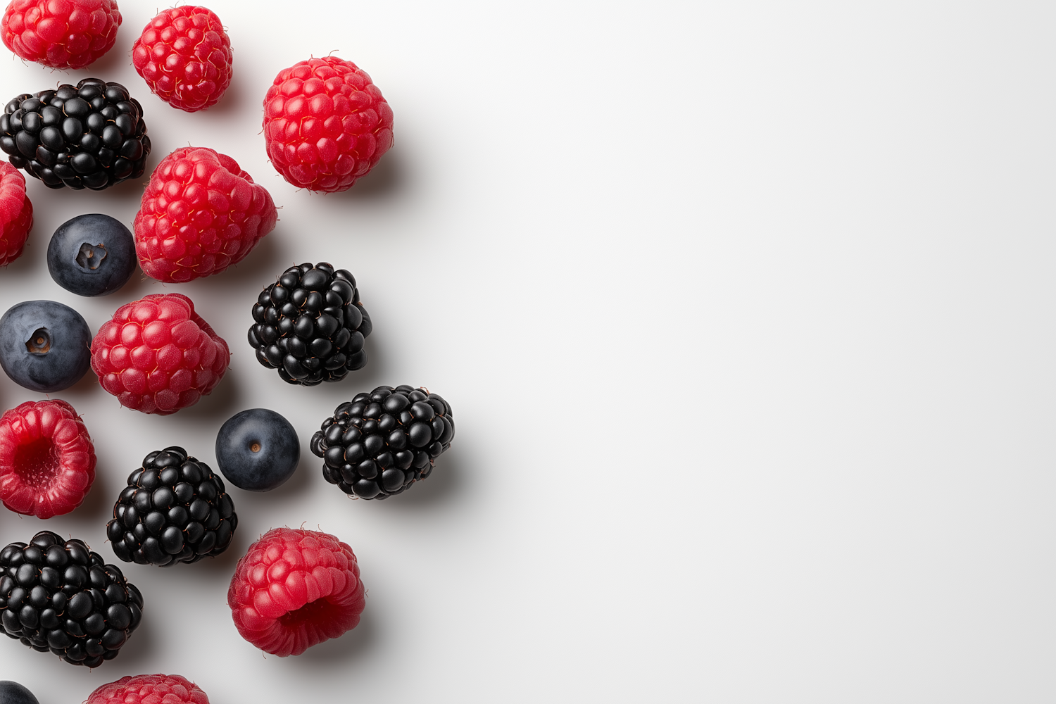 Vibrant assortment of raspberries, blackberries, and blueberries on a light background, showcasing fresh and colorful berries.